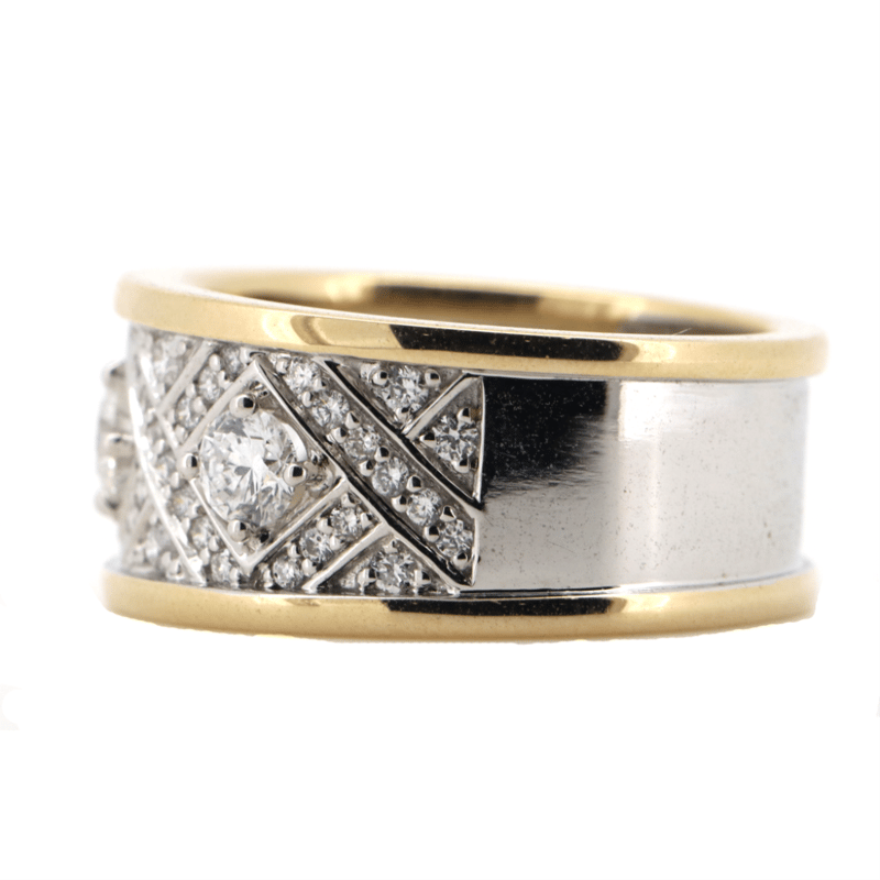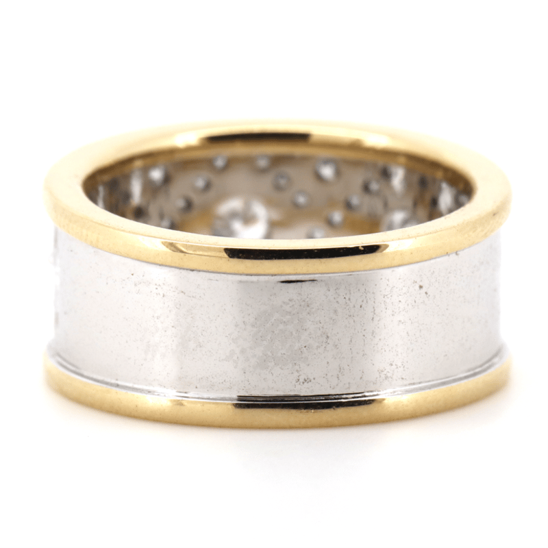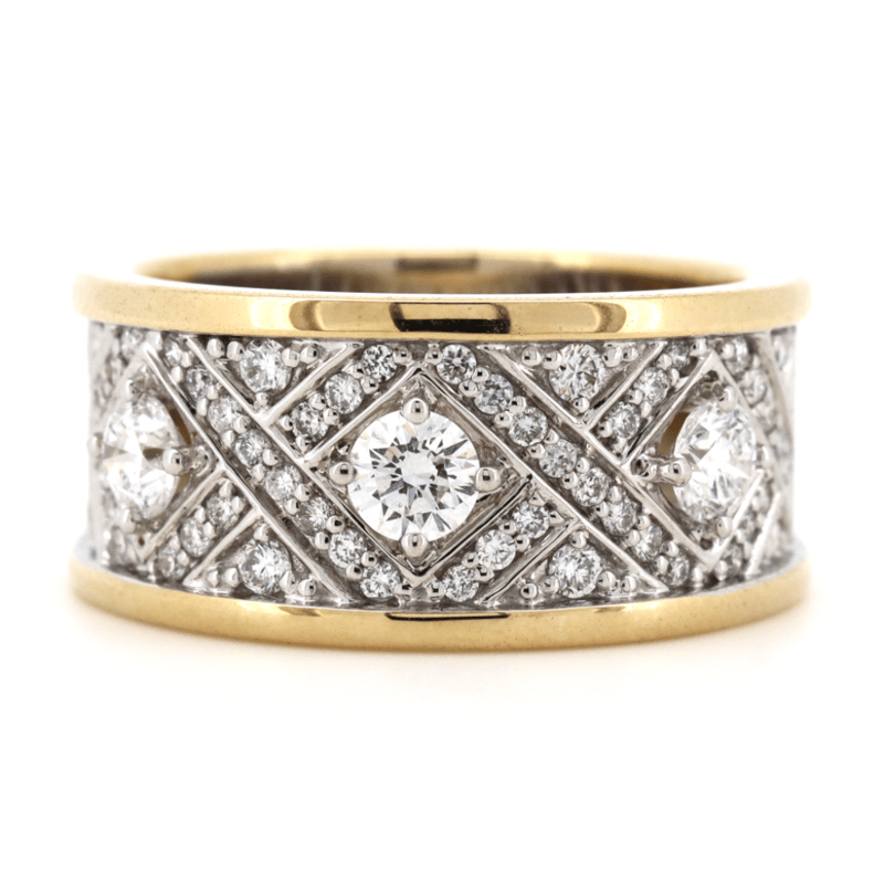 14K WHITE/YELLOW GOLD AND DIAMOND, DECORATIVE BAND RING. THE DESIGN FEATURES, 3 ROUND BRILLIANT CUT, DIAMONDS (0.57CT TDW, H-J COLOUR, P1-P2 CLARITY), CLAW SET. ENCOMPASSING THE DESIGN, ARE 56 ROUND BRILLIANT CUT, DIAMONDS (0.42CT TDW, H-J COLOUR, P1-P2 CLARITY), BEAD AND MICRO-BEAD SET\. RING SIZE N.
