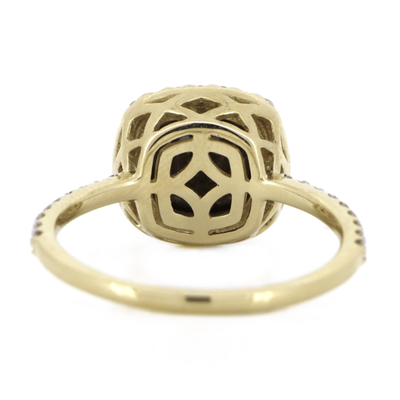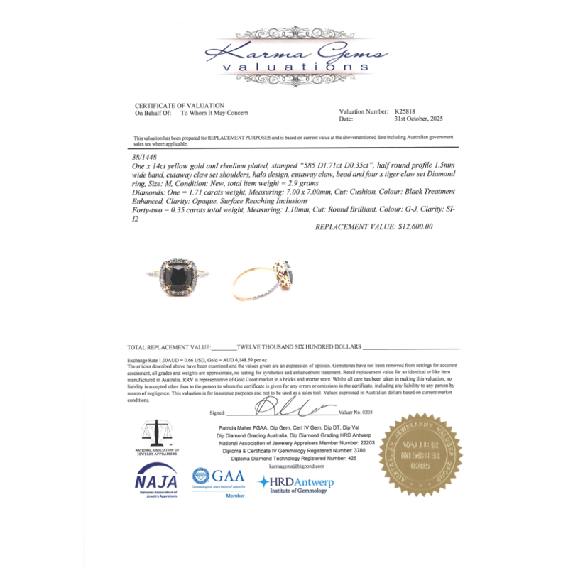 14K YELLOW GOLD, BLACK DIAMOND AND DIAMOND, HALO RING. THE CENTRE FEATURES, ONE CUSHION CUT, BLACK, DIAMOND (1.71CT, BLACK TREATED), 4 CLAW SET. SURROUNDING THE CENTRE AND DECORATING THE BAND ARE, 42 ROUND BRILLIANT CUT, DIAMONDS (0.35CT TDW, G-J COLOUR, SI-I2 CLARITY), CLAW SET. RING SIZE M.