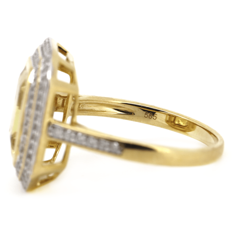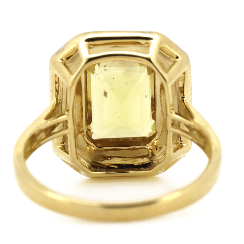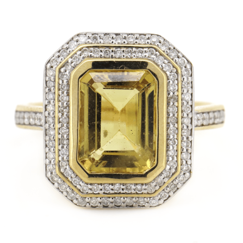 14K YELLOW GOLD, HELIODOR AND DIAMOND, DOUBLE HALO RING. THE CENTRE FEATURES, ONE EMERALD CUT, HELIODOR (2.63CT, MINOR EYE VISIBLE INCLUSIONS), BEZEL SET. SURROUNDING THE CENTRE IN A DOUBLE HALO AND DECORATING THE BAND ARE, 96 ROUND BRILLIANT CUT, DIAMONDS (0.43CT TDW, H-K COLOUR, SI1-SI2 CLARITY), BEAD SET. RING SIZE P 1/2. Valuations Provided by an Independent Third-Party Professional Not Directly Associated With Lloyds Auctions at AUD $$10,000.00This valuation has been conducted by an independent third-party professional. The valuation amount is an assessment by the issuing valuer and does not reflect the auction value of the item. Any inquiries regarding the valuation should be directed to the issuing valuer (refer to contact details on the certificate), as Lloyds Auctions has no affiliation or influence over the valuation, the valuer, or the stated amount. Condition: Good - Refer Images 0645862+358