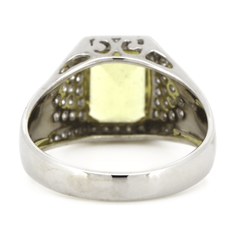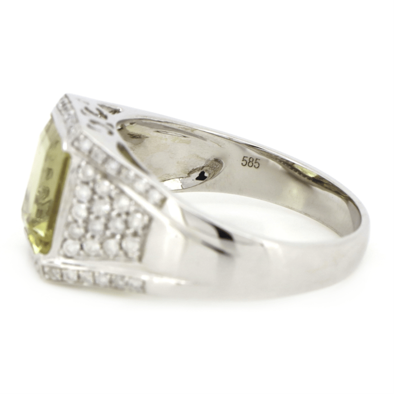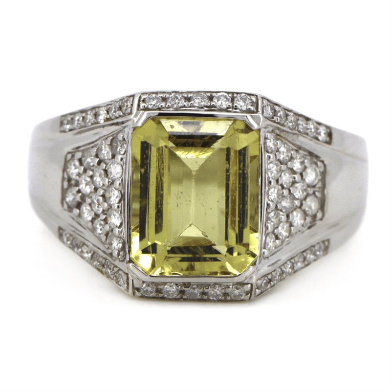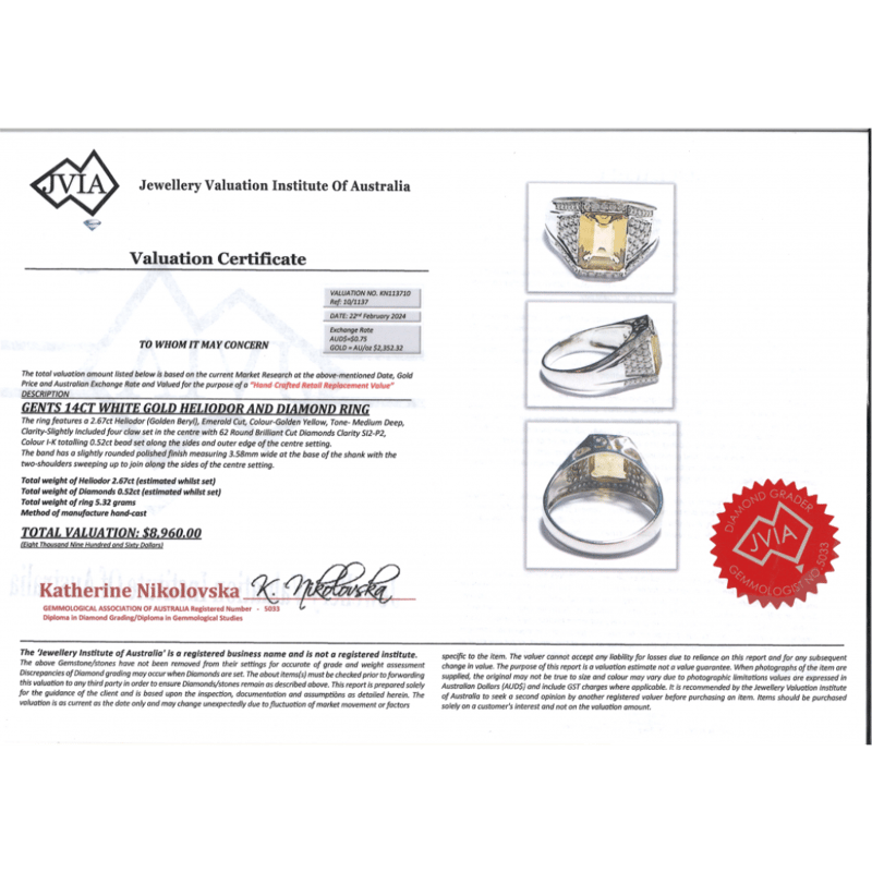 14K WHITE GOLD, GOLDEN BERYL HELIODOR AND DIAMOND, GENTS RING. THE CENTRE FEATURES, ONE EMERALD CUT, MEDIUM DEEP GOLDEN YELLOW, HELIODOR (2.67CT, SLIGHTLY INCLUDED), 4-CLAW SET. ENCOMPASSING THE DESIGN ARE, 62 ROUND BRILLIANT CUT, DIAMONDS (0.52CT TDW, I-K COLOUR, SI2-P2 CLARITY), BEAD SET. RING SIZE T 1/2. Valuations Provided by an Independent Third-Party Professional Not Directly Associated With Lloyds Auctions at AUD $$8,960.00This valuation has been conducted by an independent third-party professional. The valuation amount is an assessment by the issuing valuer and does not reflect the auction value of the item. Any inquiries regarding the valuation should be directed to the issuing valuer (refer to contact details on the certificate), as Lloyds Auctions has no affiliation or influence over the valuation, the valuer, or the stated amount. Condition: Good - Refer Images 0645862+391