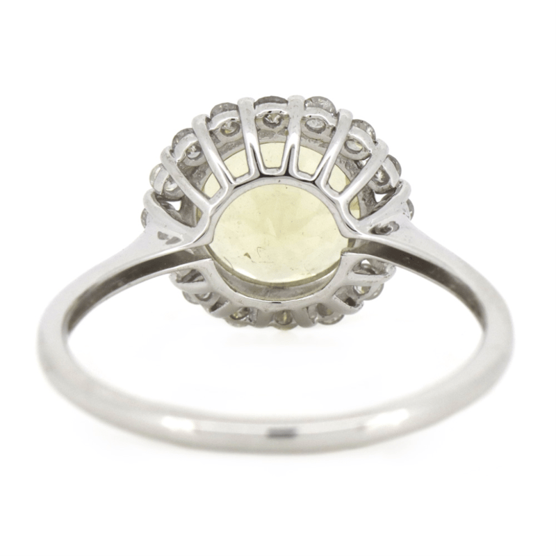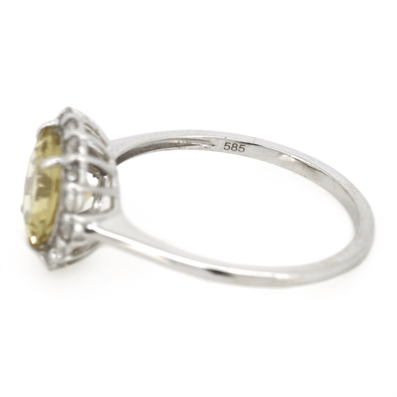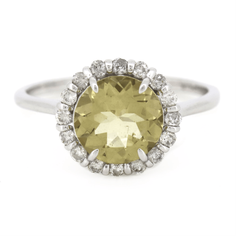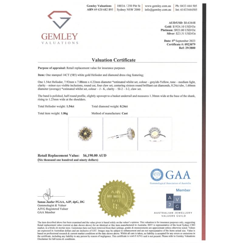 14K WHITE GOLD, HELIODOR AND DIAMOND, HALO RING. THE CENTRE FEATURES, ONE ROUND CUT, MEDIUM LIGHT GREYISH-YELLOW, HELIODOR (1.54CT, MINOR EYE VISIBLE INCLUSIONS), CLAW SET. SURROUNDING THE CENTRE IN A HALO ARE, 16 ROUND BRILLIANT CUT, DIAMONDS (0.24CT TDW, J-K COLOUR, SI2-I2 CLARITY), CLAW SET. RING SIZE M. Valuations Provided by an Independent Third-Party Professional Not Directly Associated With Lloyds Auctions at AUD $$6,190.00This valuation has been conducted by an independent third-party professional. The valuation amount is an assessment by the issuing valuer and does not reflect the auction value of the item. Any inquiries regarding the valuation should be directed to the issuing valuer (refer to contact details on the certificate), as Lloyds Auctions has no affiliation or influence over the valuation, the valuer, or the stated amount. Condition: Good - Refer Images 0645862+377