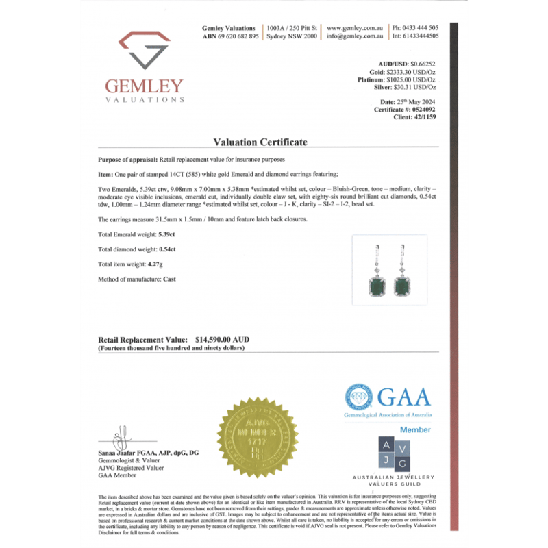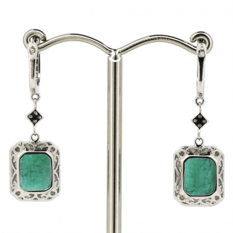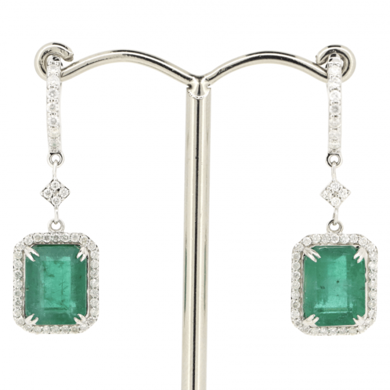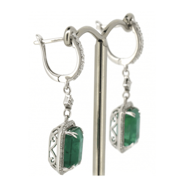 14K WHITE GOLD, EMERALD AND DIAMOND, ANTIQUE INSPIRED EARRINGS. THE DROPS FEATURE, 2 EMERALD CUT, MEDIUM BLUISH-GREEN, EMERALDS (5.39CT TSW, MODERATE EYE VISIBLE INCLUSIONS), 4 CLAW SET. SURROUNDING THE EMERALDS IN HALOS AND DECORATING THE HOOKS ARE, 86 ROUND BRILLIANT CUT, DIAMONDS (0.54CT TDW, J-K COLOUR, SI2-I2 CLARITY), BEAD SET. THE EARRINGS FEATURE LATCH BACK CLOSURES.