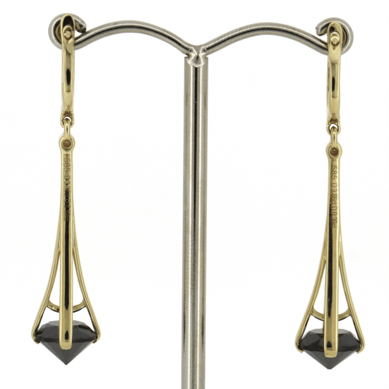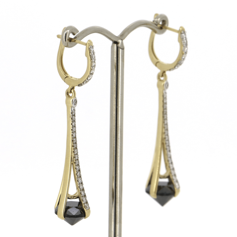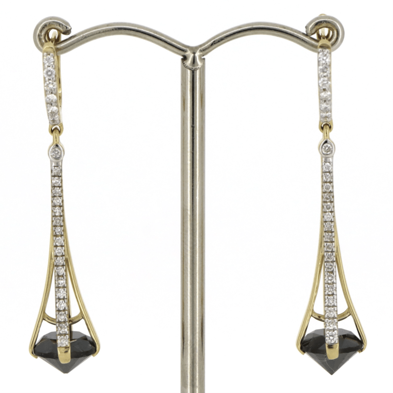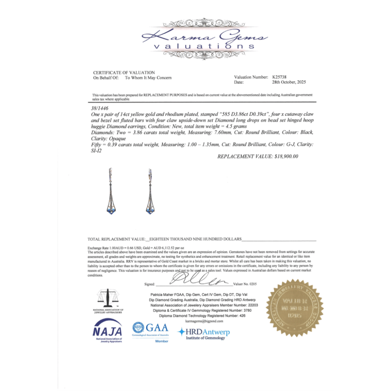 14K YELLOW GOLD, BLACK DIAMOND AND DIAMOND, DROP EARRINGS. THE CENTRES FEATURE, 2 ROUND BRILLIANT CUT, BLACK, DIAMONDS (3.86CT TDW, OPAQUE), CLAW SET. DECORATING THE DROPS AND HOOKS ARE, 50 ROUND BRILLIANT CUT, DIAMONDS (0.39CT TDW, G-J COLOUR, SI-I2 CLARITY), BEAD SET. THE EARRINGS FEATURE, HALF HOOPED HINGED CLIPS. Valuations Provided by an Independent Third-Party Professional Not Directly Associated With Lloyds Auctions at AUD $$18,900.00This valuation has been conducted by an independent third-party professional. The valuation amount is an assessment by the issuing valuer and does not reflect the auction value of the item. Any inquiries regarding the valuation should be directed to the issuing valuer (refer to contact details on the certificate), as Lloyds Auctions has no affiliation or influence over the valuation, the valuer, or the stated amount. Condition: Good - Refer Images 0645862+390