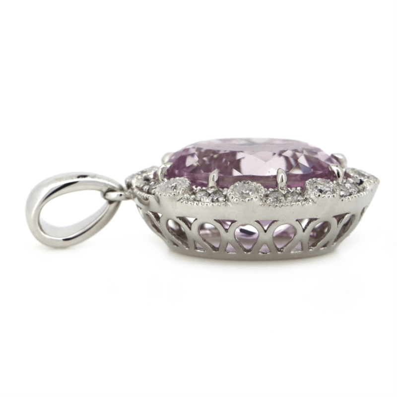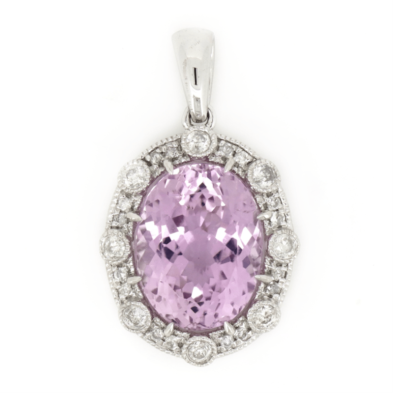 14K WHITE GOLD, KUNZITE AND DIAMOND, HALO PENDANT. THE CENTRE FEATURES, ONE OVAL FACETED, MEDIUM DEEP PURPLISH-PINK, KUNZITE (5.13CT, EYE CLEAN CLARITY), 4 CLAW SET. SURROUNDING THE CENTRE IN A HALO ARE, 24 ROUND BRILLIANT CUT, DIAMONDS (0.28CT TDW, I-K COLOUR, P1-P3 CLARITY), BEZEL/BEAD SET. Valuations Provided by an Independent Third-Party Professional Not Directly Associated With Lloyds Auctions at AUD $$8,580.00This valuation has been conducted by an independent third-party professional. The valuation amount is an assessment by the issuing valuer and does not reflect the auction value of the item. Any inquiries regarding the valuation should be directed to the issuing valuer (refer to contact details on the certificate), as Lloyds Auctions has no affiliation or influence over the valuation, the valuer, or the stated amount. Condition: Good - Refer Images 0645862+304
