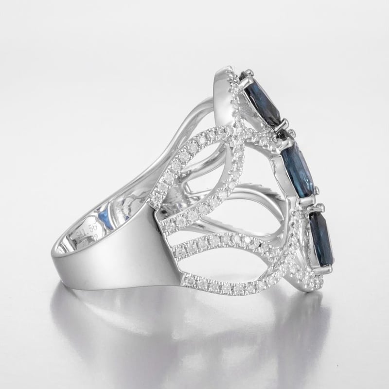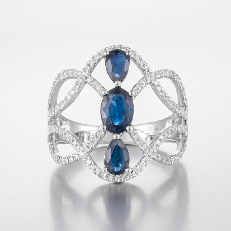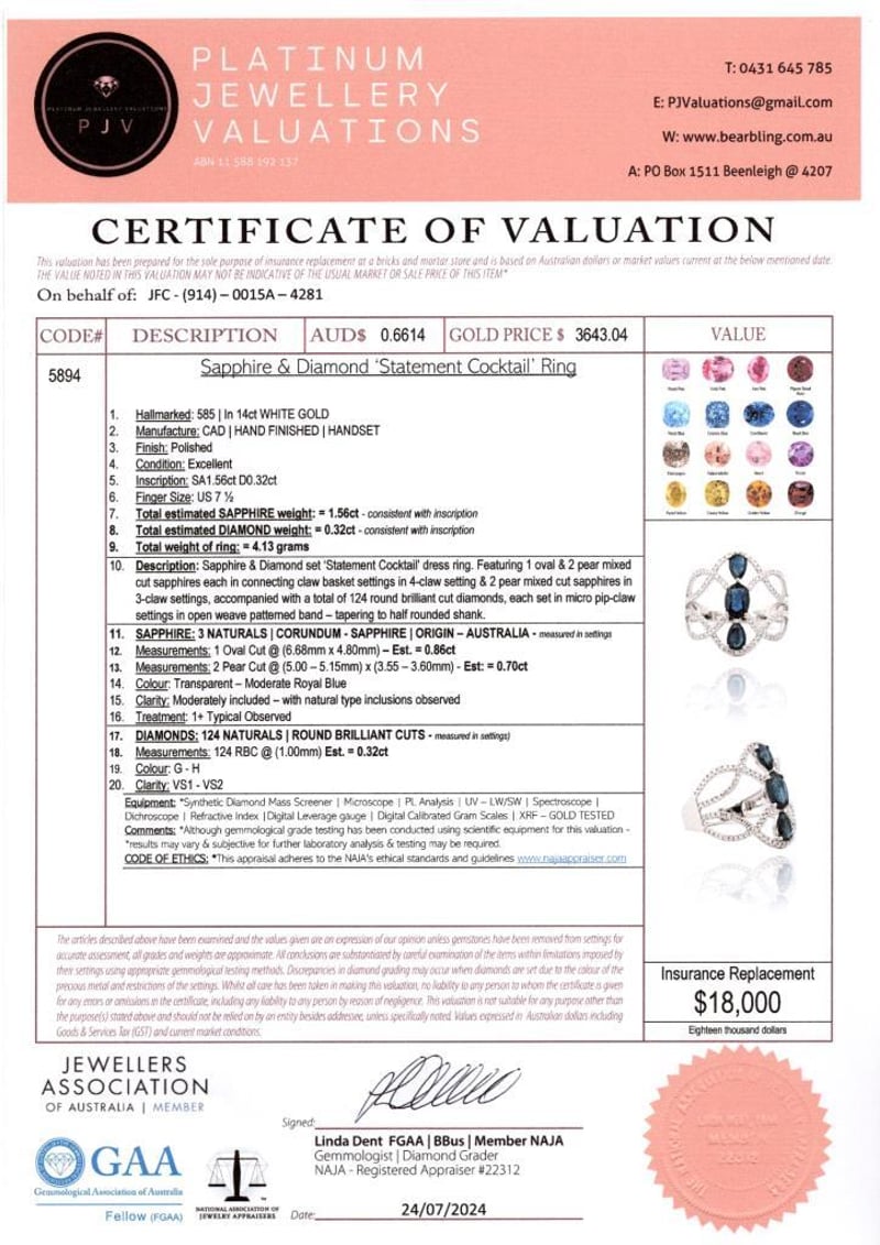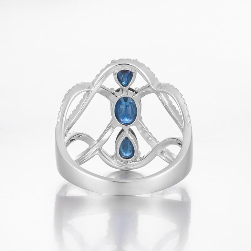 14Ct White Gold Australian Sapphire And Diamond Statement Ring Featuring Centre, One Oval And 2 Pear Cut, Moderate Royal Blue Australian Sapphires (1.56Ct Tsw, Moderately Included), Claw Set, With 124 Round Brilliant Cut Diamonds (0.32Ct Tdw, G-H Colour, Vs1-Vs2 Clarity), Bead Set. Ring Size O.