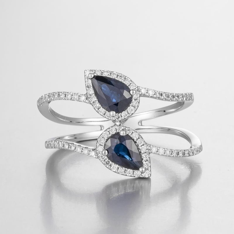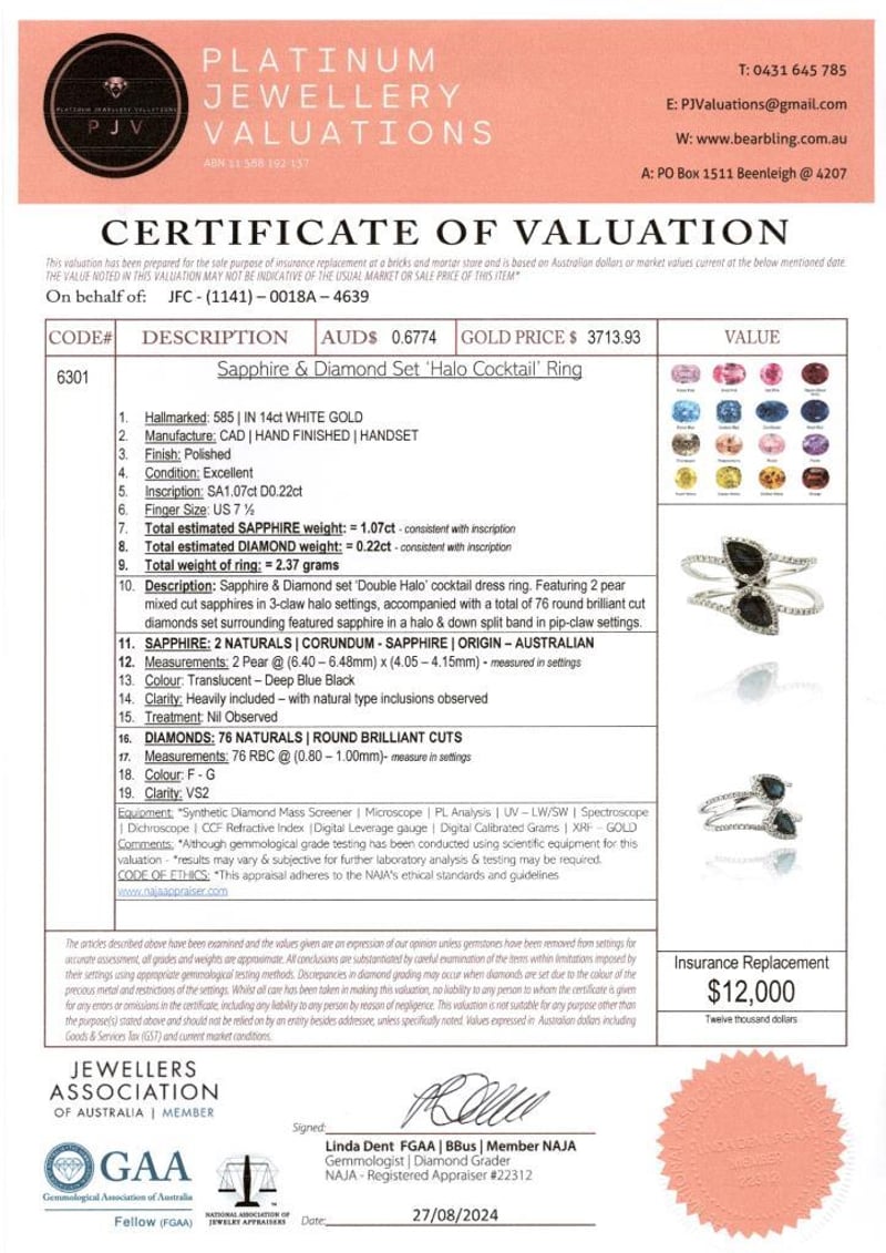 14Ct White Gold Australian Sapphire And Diamond Dress Ring Featuring Centre, 2 Pear Cut, Deep Blue Black Australian Sapphires (1.07Ct Tsw, Heavily Included), Claw Set, With 76 Round Brilliant Cut Diamonds (0.22Ct Tdw, F-G Colour, Vs2 Clarity), Pip Claw Set. Ring Size O.