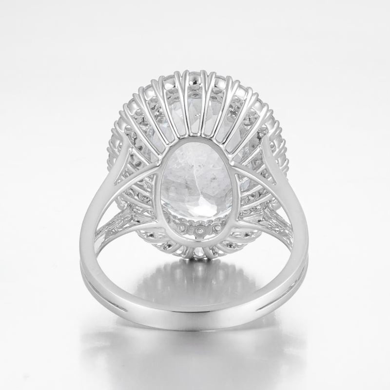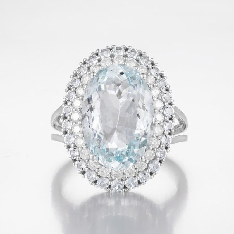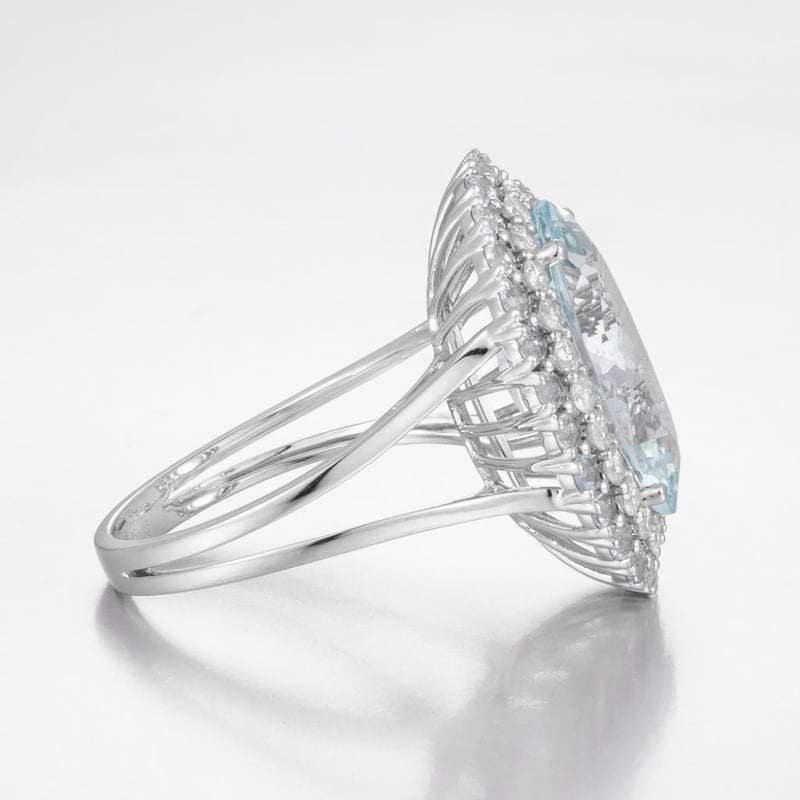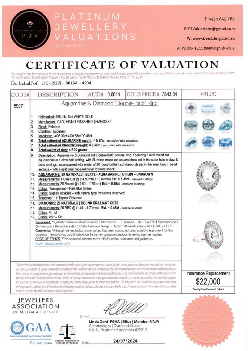 14Ct White Gold Aquamarine And Diamond Cocktail Ring Featuring Centre, One Oval Cut, Pale Blue-Green Aquamarine (5.39Ct, Slightly Included), Claw Set, With 24 Round Brilliant Cut Diamonds (0.46Ct Tdw, G-M Colour, Vs1-Si1 Clarity), Bead Set, And 26 Round Cut, Pale Blue-Green Aquamarines (0.58Ct Tsw, Slightly Included), Bead Set. Ring Size O.