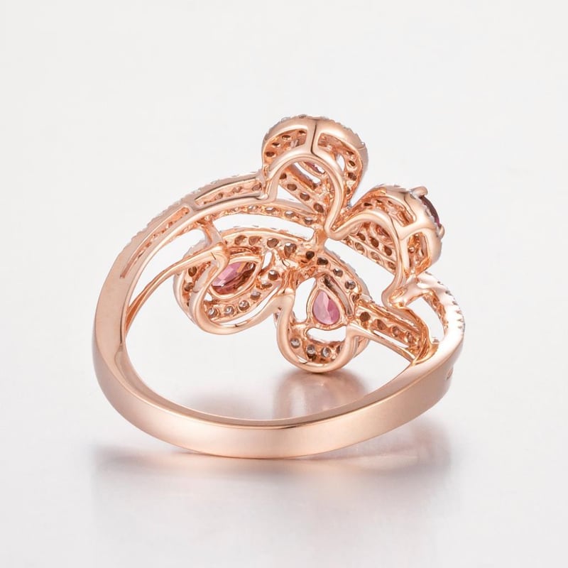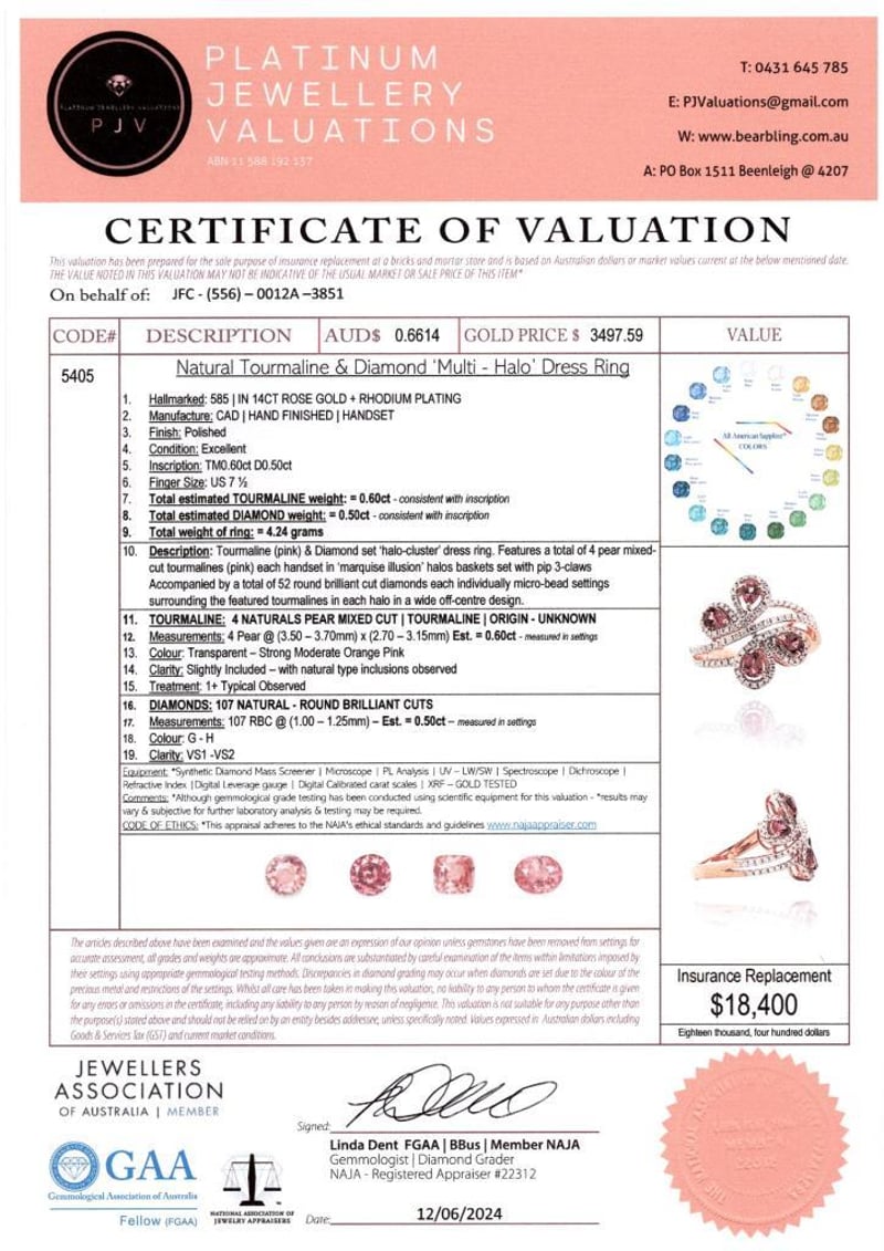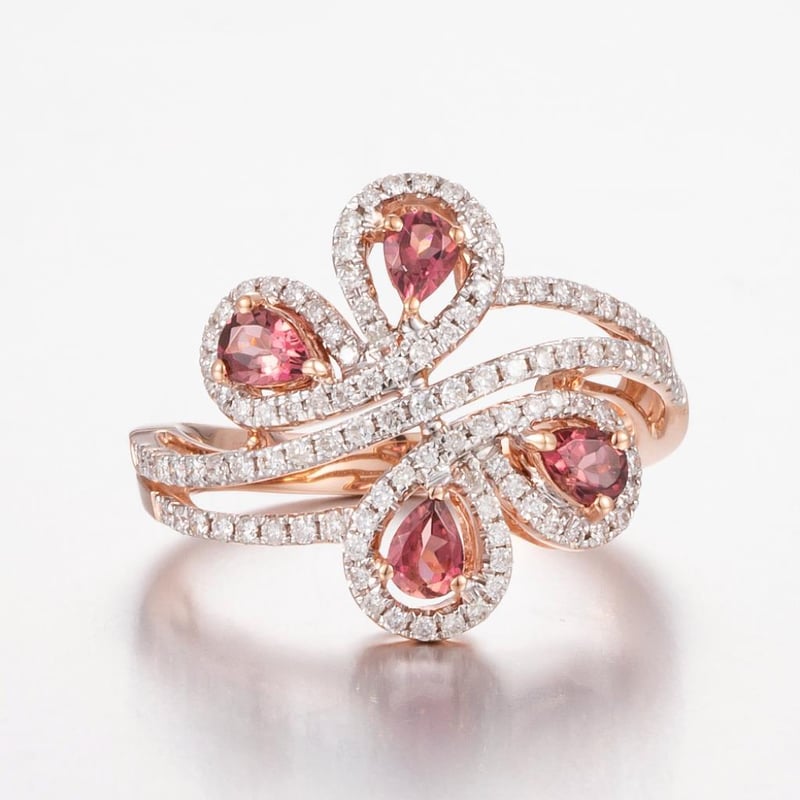 14Ct Rose Gold Tourmaline And Diamond Decorative Ring Featuring Centre, 4 Pear Cut, Strong Moderate Orange Pink Tourmalines (0.60Ct Tsw, Slightly Included), Pip Claw Set, With 107 Round Brilliant Cut Diamonds (0.50Ct Tdw, G-H Colour, Vs1-Vs2 Clarity), Bead Set. Ring Size O.
