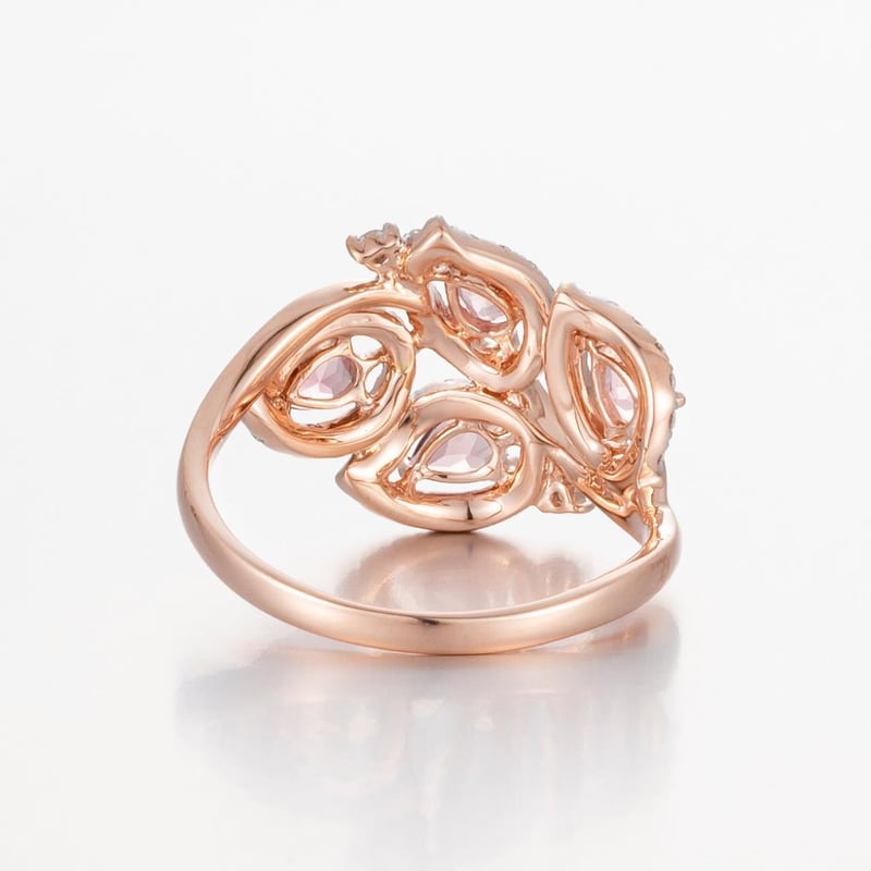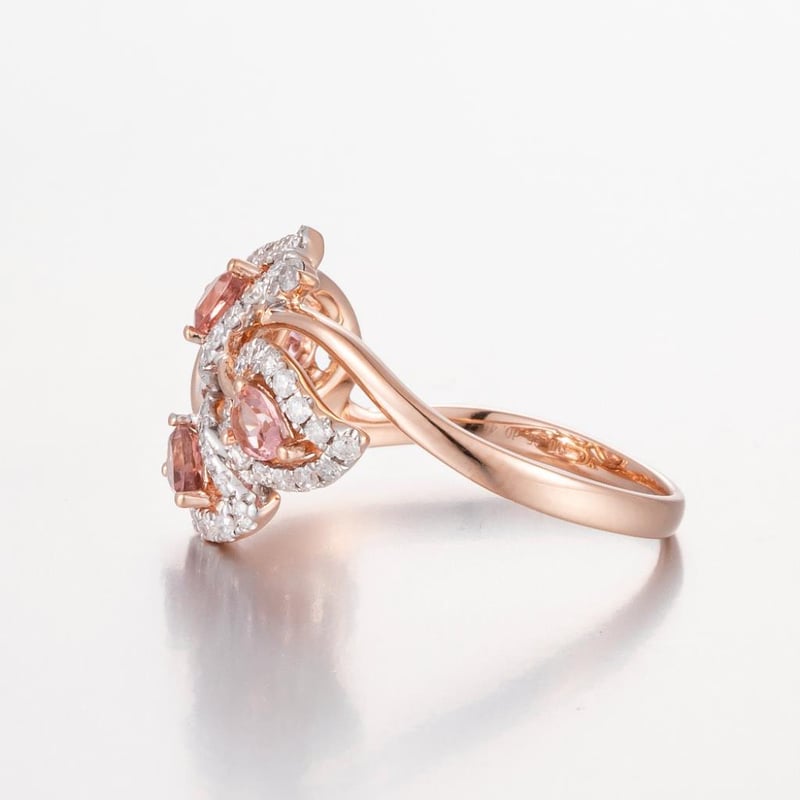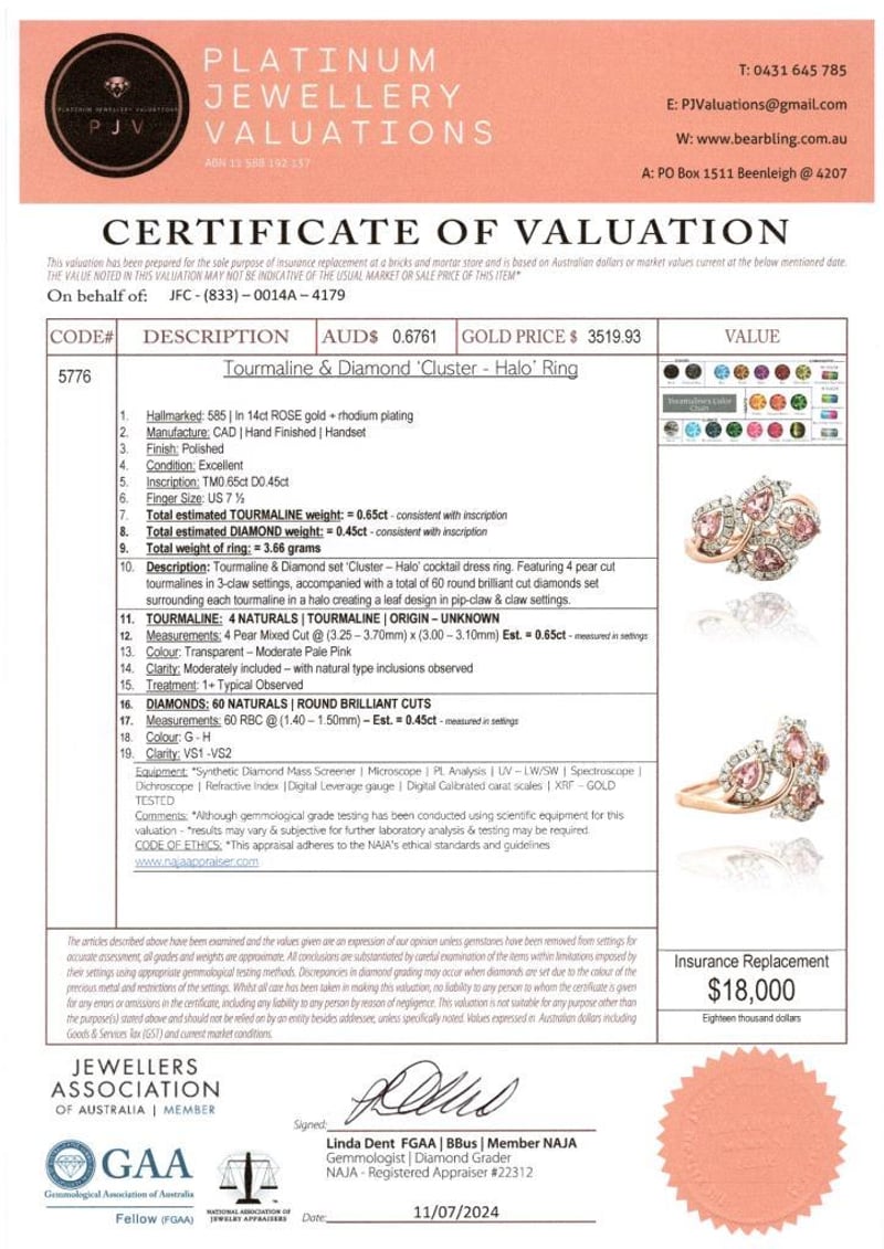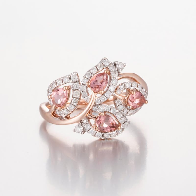 14Ct Rose Gold Tourmaline And Diamond Cluster Ring Featuring Centre, 4 Pear Cut, Moderate Pale Pink Tourmalines (0.65Ct Tsw Moderately Included), Claw Set, With 60 Round Brilliant Cut Diamonds (0.45Ct Tdw, G-H Colour, Vs1-Vs2 Clarity), Pip Claw/Claw Set. Ring Size O.