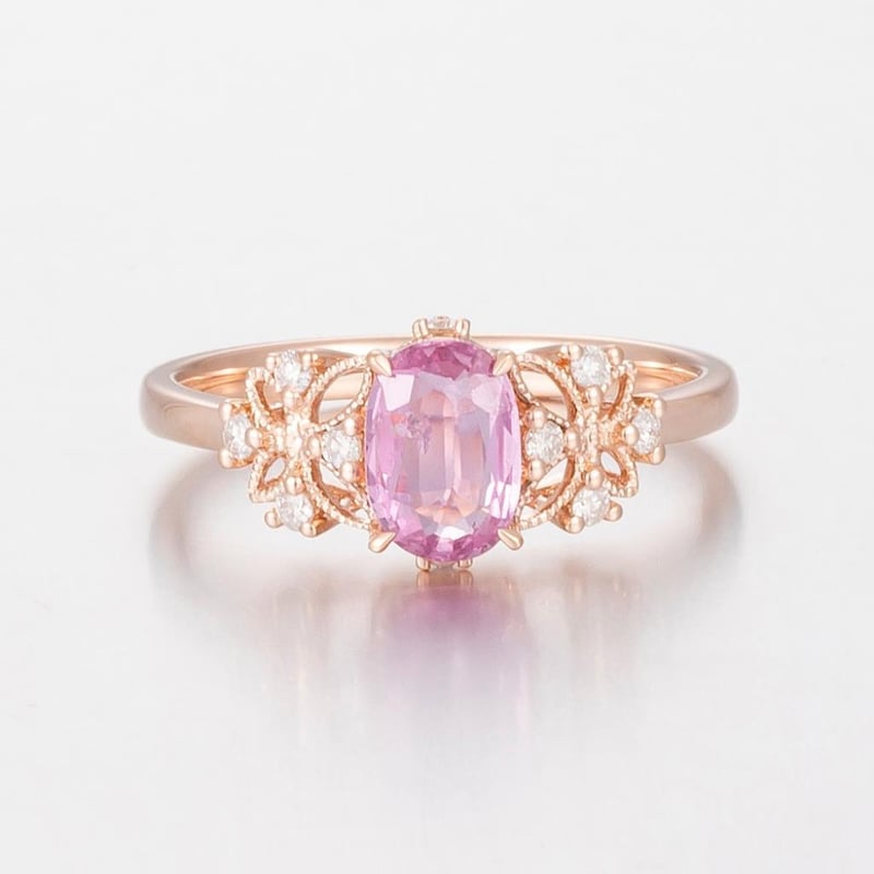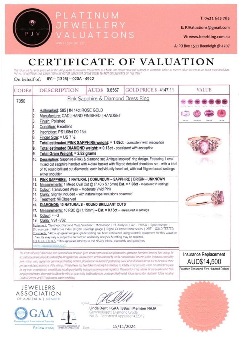 14CT ROSE GOLD PINK SAPPHIRE AND DIAMOND DRESS RING 14Ct Rose Gold Pink Sapphire And Diamond Dress Ring Featuring Centre, One Oval Cut, Moderate Vivid Pink Sapphire (1.08Ct, Slightly Included), Claw Set, With 10 Round Brilliant Cut Diamonds (0.13Ct Tdw, F-G Colour, Vs1-Vs2 Clarity), Bead Set. Ring Size O. Jewellery Valuations Provided By A Third Party Professional Not Directly Associated With Lloyds Auctions at AUD $14500This Insurance Valuation has been provided by a registered Jewellery Valuer and is intended for insurance purposes only. The valuation amount has no bearing on the auction value of the item. Any questions regarding the valuation should be directed to the issuing Valuer (refer to contact details on the certificate) as Lloyds have no association or relationship with the Valuer or the valuation amount contained within the valuation. 0586262+1496