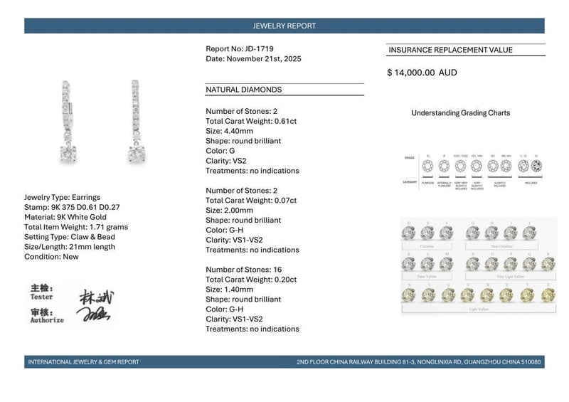 9CT WHITE GOLD DIAMOND HUGGIE EARRINGS 9Ct White Gold Diamond Huggie Earrings Featuring, 2 Round Brilliant Cut Diamonds (0.61Ct Tdw, G Colour, Vs2 Clarity), Claw Set, With 2 Round Brilliant Cut Diamonds (0.07Ct Tdw, G-H Colour, Vs1-Vs2 Clarity), Claw Set, And 16 Round Brilliant Cut Diamonds (0.20Ct Tdw, G-H Colur, Vs1-Vs2 Clarity), Bead Set. Jewellery Valuations Provided By A Third Party Professional Not Directly Associated With Lloyds Auctions at AUD $14000This Insurance Valuation has been provided by a registered Jewellery Valuer and is intended for insurance purposes only. The valuation amount has no bearing on the auction value of the item. Any questions regarding the valuation should be directed to the issuing Valuer (refer to contact details on the certificate) as Lloyds have no association or relationship with the Valuer or the valuation amount contained within the valuation. 0586262+1527