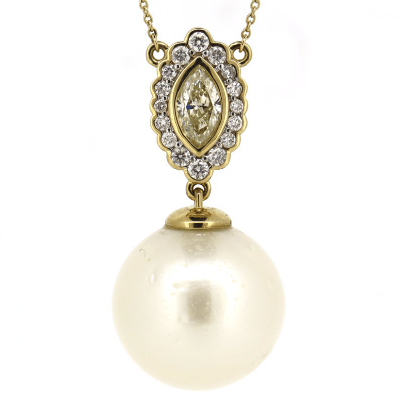 The Necklace Features, One Round, White Cultured South Sea Pearl (30.49Ct, Good Lustre, Medium Blemishes), Cap Set. Decorating The Bail Are, 22 Round Brilliant Cut, Diamonds (0.37Ct Tdw, H-I Colour, Si-I1 Clarity), In The Centre Are, One Round Brilliant Cut, Light Fancy Yellow, Diamond (0.71Ct, Si2 Clarity), Bead Set.