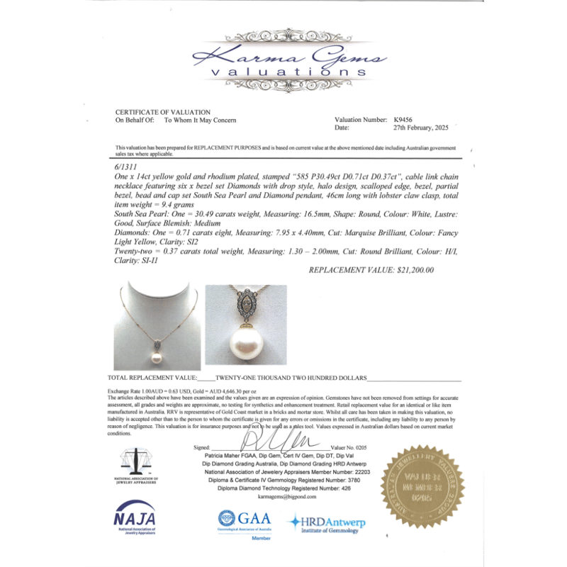 This Insurance Valuation has been provided by a registered Jewellery Valuer and is intended for insurance purposes only. The valuation amount has no bearing on the auction value of the item. Any questions regarding the valuation should be directed to the issuing Valuer (refer to contact details on the certificate) as Lloyds have no association or relationship with the Valuer or the valuation amount contained within the valuation.