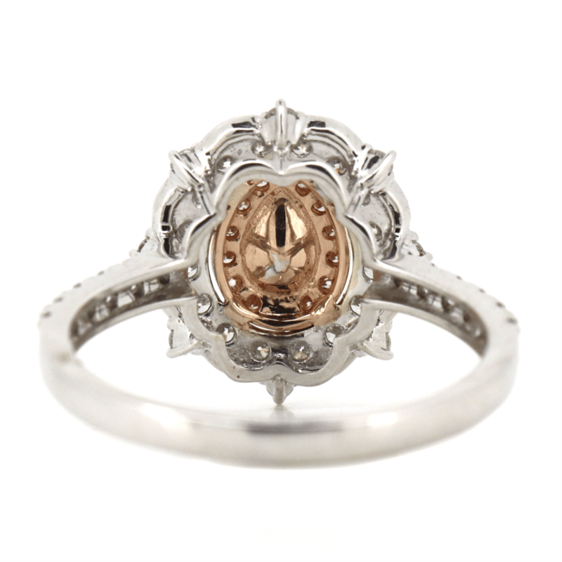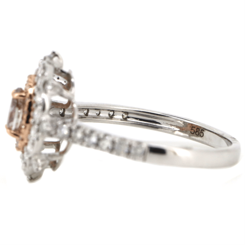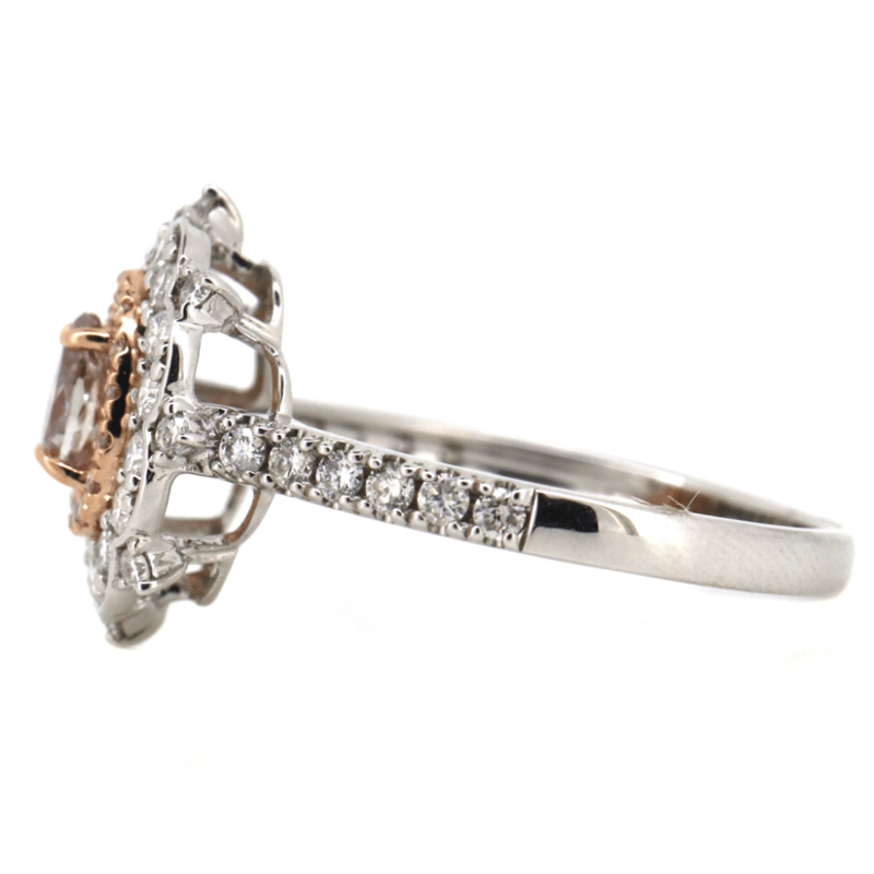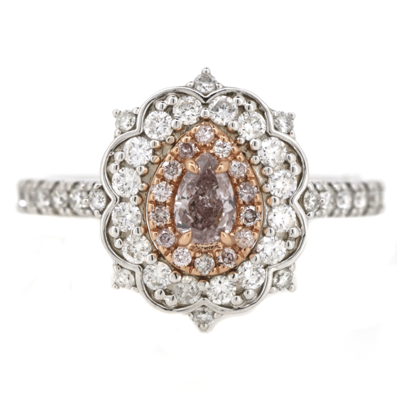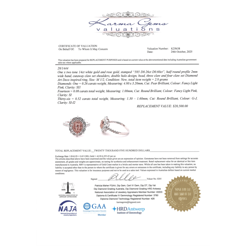 14K WHITE/ROSE GOLD, PINK DIAMOND AND DIAMOND, DOUBLE HALO RING. The Centre Features, One Pear Modified Cut, Fancy Pink, Diamond (0.26Ct, Si1 Clarity), Claw Set In Rose Gold. Decorating The Innermost Halo Are, 14 Round Brilliant Cut, Pink, Diamonds (0.08Ct, Si Clarity), Bead Set In Rose Gold. Decorating The Outermost Halo And The Band Are, 36 Round Brilliant Cut, Diamonds (0.52Ct Tdw, G-J Colour, Si-I2 Clarity), Bead Set. Ring Size M 1/2. Jewellery Valuations Provided By A Third Party Professional Not Directly Associated With Lloyds Auctions at AUD $20,500.00This Insurance Valuation has been provided by a registered Jewellery Valuer and is intended for insurance purposes only. The valuation amount has no bearing on the auction value of the item. Any questions regarding the valuation should be directed to the issuing Valuer (refer to contact details on the certificate) as Lloyds have no association or relationship with the Valuer or the valuation amount contained within the valuation. Condition: NEW 0645874+21