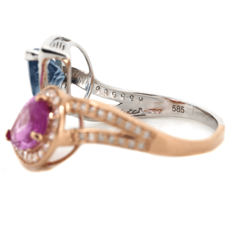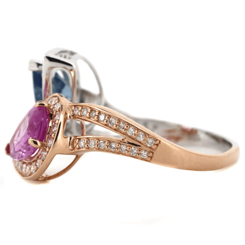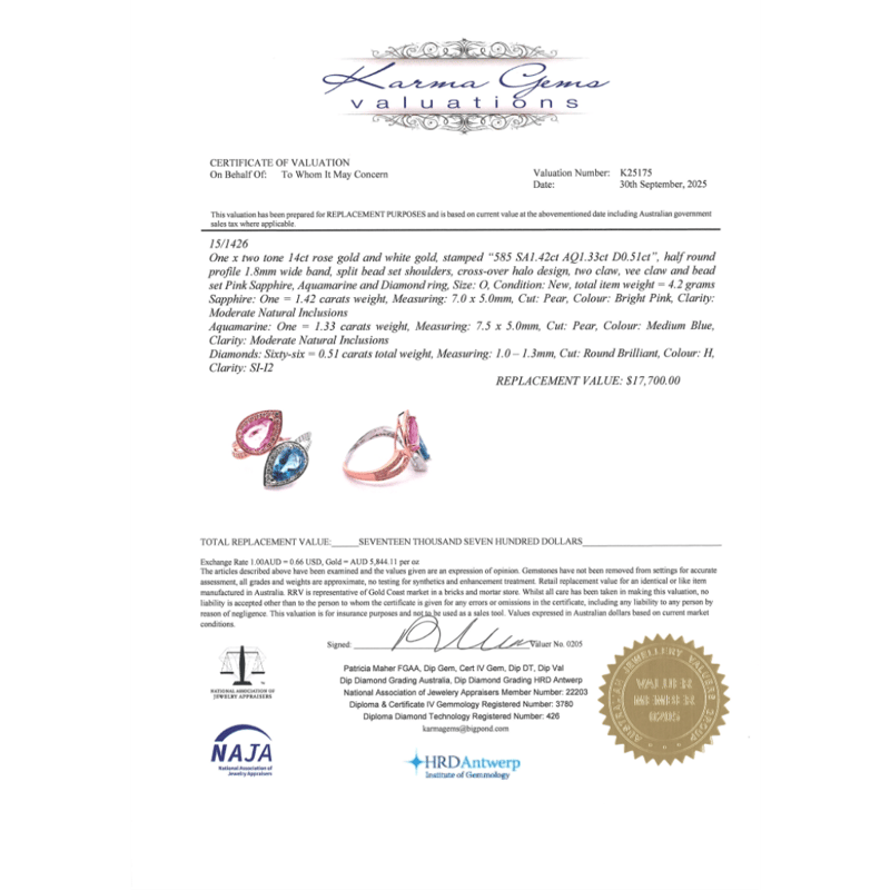 14K WHITE/ROSE GOLD, PINK SAPPHIRE, AQUAMARINE AND DIAMOND, OPEN BAND DRESS RING. The Design Features, 1 Pear Cut, Pink Sapphire (1.42Ct, Moderate Natural Inclusions) And 1 Pear Cut Aquamarine (1.33Ct, Moderate Natural Inclusions), 3 Claw Set. Encompassing The Design Are, 66 Round Brilliant Cut, Diamonds (0.51Ct Tdw, H Colour, Si-I2 Clarity), Bead Set. Ring Size O. Jewellery Valuations Provided By A Third Party Professional Not Directly Associated With Lloyds Auctions at AUD $17,700.00This Insurance Valuation has been provided by a registered Jewellery Valuer and is intended for insurance purposes only. The valuation amount has no bearing on the auction value of the item. Any questions regarding the valuation should be directed to the issuing Valuer (refer to contact details on the certificate) as Lloyds have no association or relationship with the Valuer or the valuation amount contained within the valuation. Condition: NEW 0645874+48