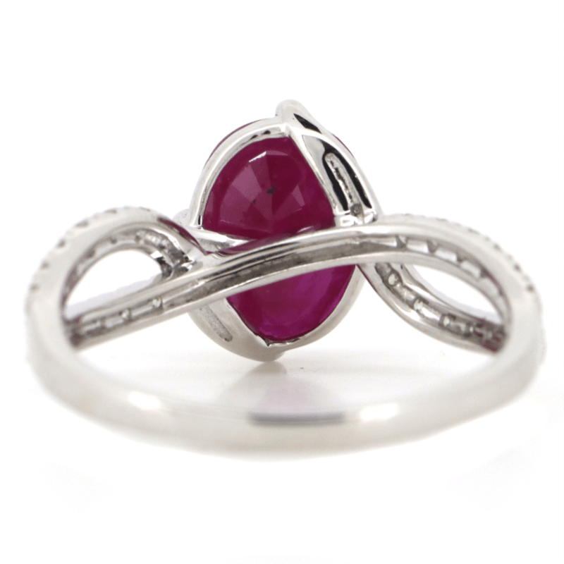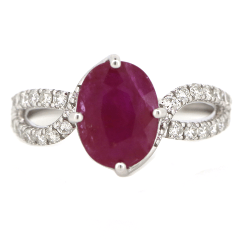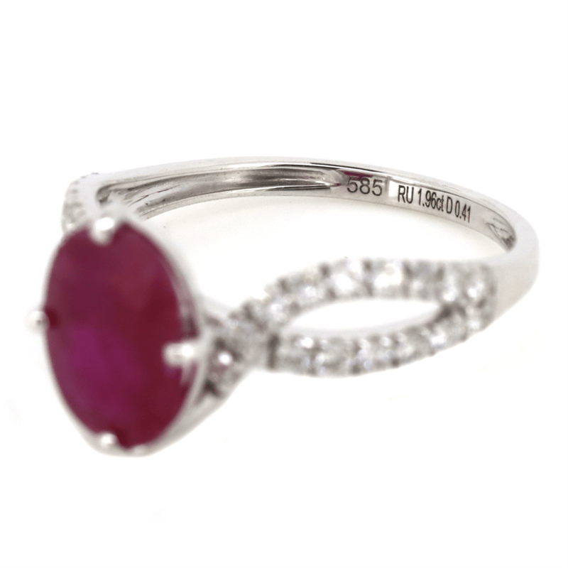 The Centre Features, One Oval Cut, Dark Pinkish-Red, Ruby (1.96Ct, Surface Reaching Inclusions), Claw Set. Decorating The Twist Band Are, 30 Round Brilliant Cut, Diamonds (0.41Ct Tdw, G-J Colour, Si-I2 Clarity), Micro-Claw Set. Ring Size M.