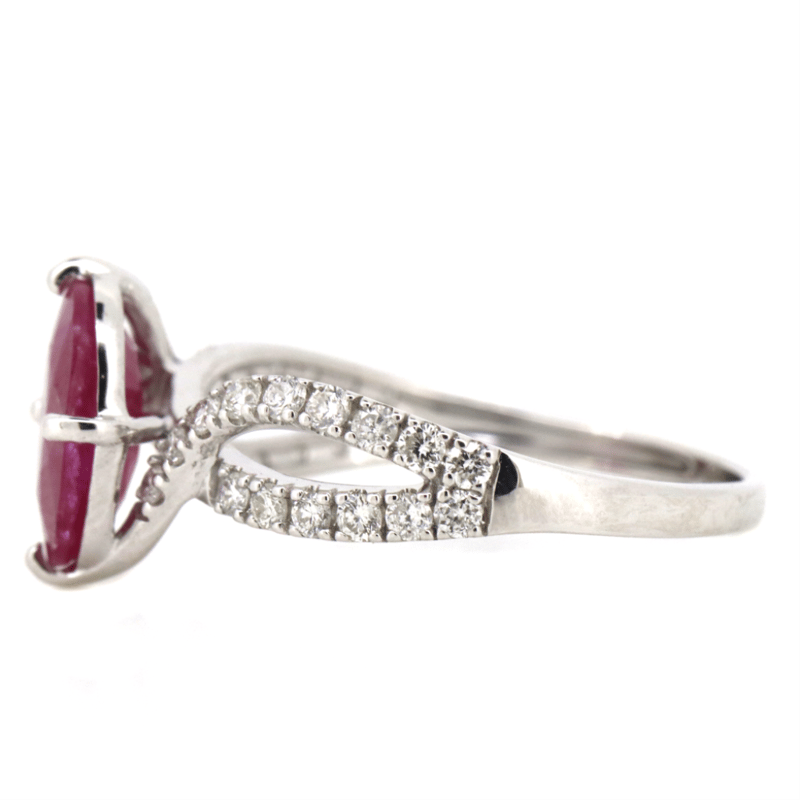 14K WHITE GOLD, RUBY AND DIAMOND, TWIST BAND RING.