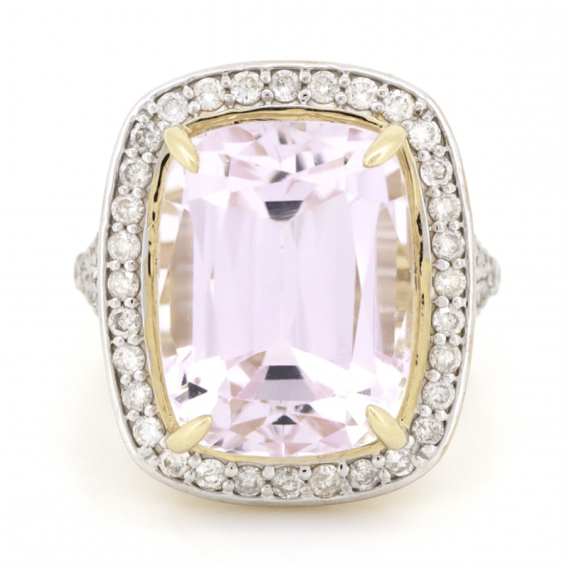 The Centre Features, One Cushion Cut, Light Purplish-Pink, Kunzite (15.99Ct, Very Minor Eye Visible Inclusions), 4 Claw Set. Surrounding The Centre In A Halo And Decorating The Shoulders Are, 66 Round Brilliant Cut, Diamonds (0.78Ct Tdw, J-K Colour, Si2-I2 Clarity), Micro-Claw/Bead Set In White Gold. Ring Size L 1/2.