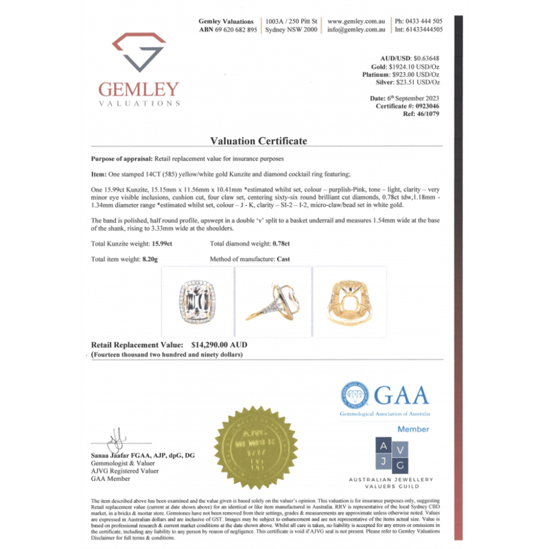 This Insurance Valuation has been provided by a registered Jewellery Valuer and is intended for insurance purposes only. The valuation amount has no bearing on the auction value of the item. Any questions regarding the valuation should be directed to the issuing Valuer (refer to contact details on the certificate) as Lloyds have no association or relationship with the Valuer or the valuation amount contained within the valuation.