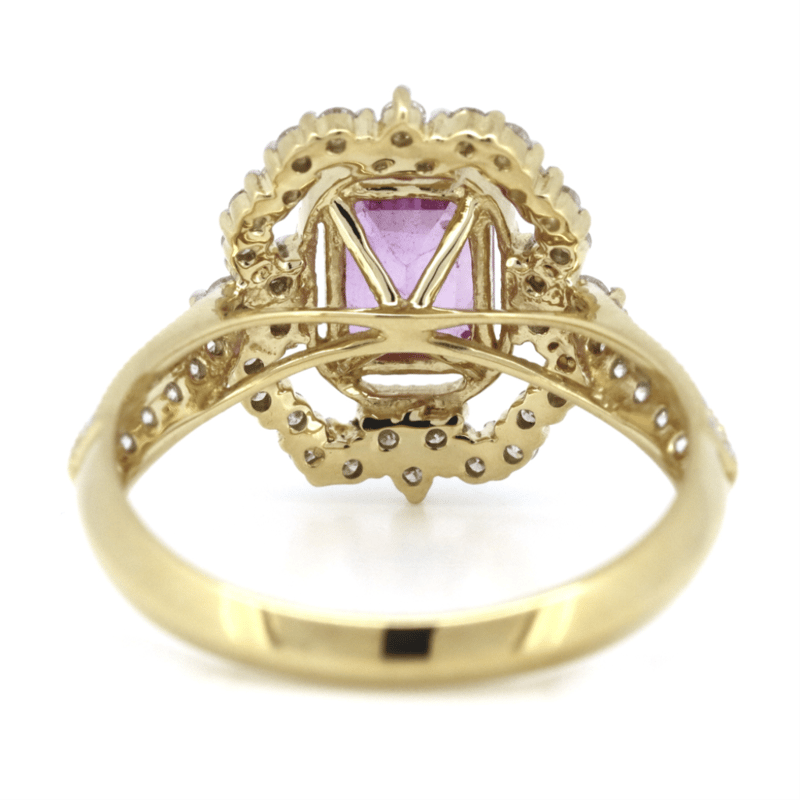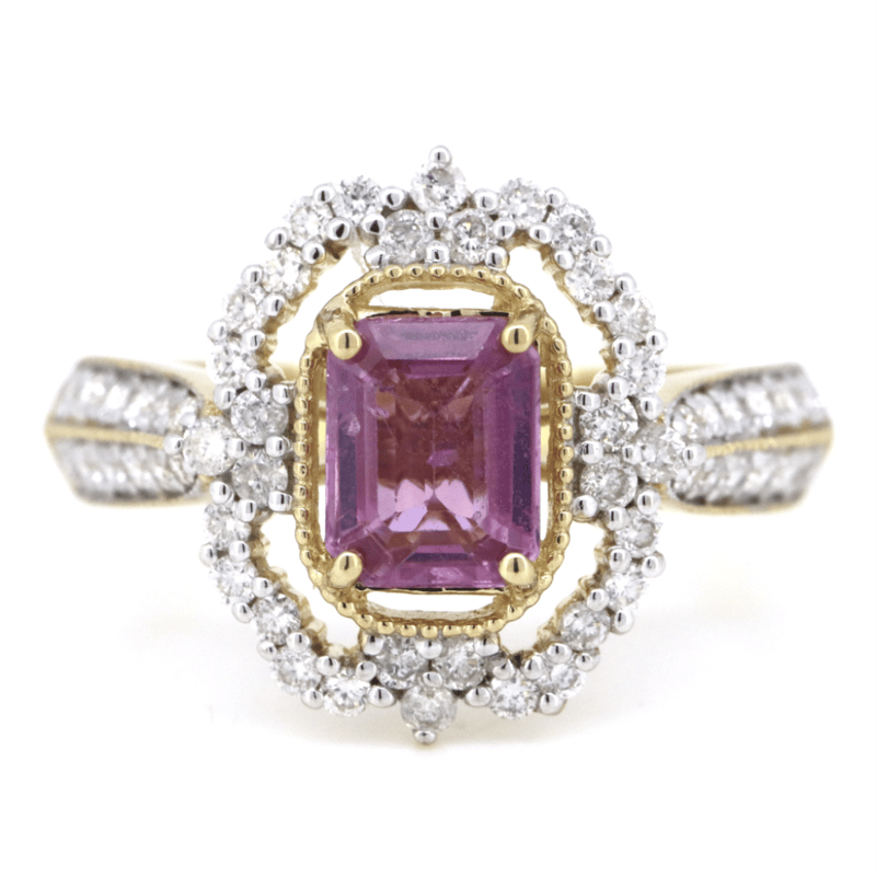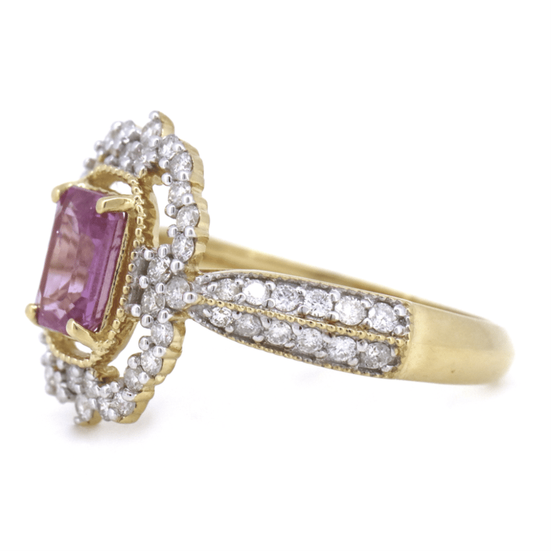 The Centre Features, Emerald Cut, Pink, Sapphire (1.11Ct Tsw, Light Natural Inclusions-Clarity), 4 Claw Set. Encompassing The Design Are, 56 Round Brilliant Cut, Diamonds (0.52Ct Tdw, H-J Colour, Si-I2 Clarity), Bead Set In White Gold With Millegrain Detail. Ring Size M.