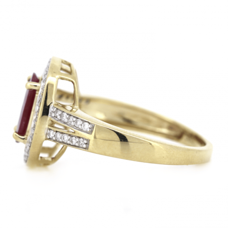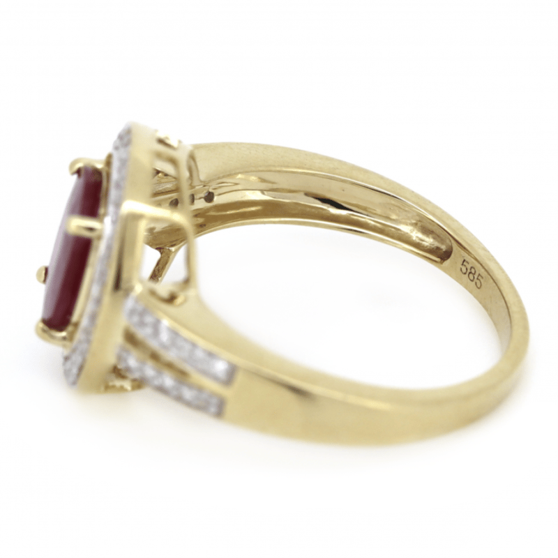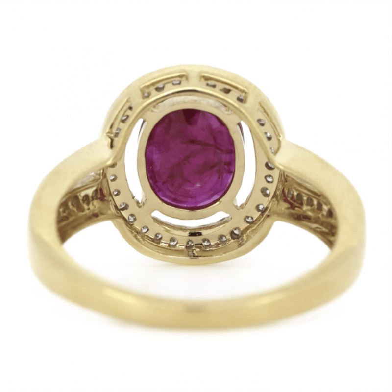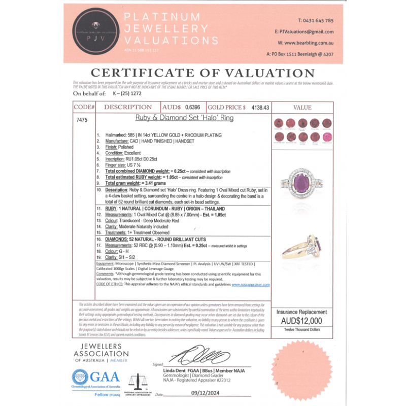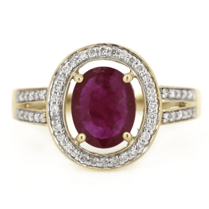 14K YELLOW GOLD, RUBY AND DIAMOND, HALO SPLIT BAND RING. The Centre Features, One Oval Cut, Deep Moderate Red, Ruby (1.05Ct, Moderate Eye Visible Inclusions), Claw Set. Surrounding The Centre In A Halo And Decorating The Band Are, 52 Round Brilliant Cut, Diamonds (0.25Ct Tdw, G-H Colour, Si1-Si2 Clarity), Bead Set In White Gold. Ring Size O. Jewellery Valuations Provided By A Third Party Professional Not Directly Associated With Lloyds Auctions at AUD $12,000.00This Insurance Valuation has been provided by a registered Jewellery Valuer and is intended for insurance purposes only. The valuation amount has no bearing on the auction value of the item. Any questions regarding the valuation should be directed to the issuing Valuer (refer to contact details on the certificate) as Lloyds have no association or relationship with the Valuer or the valuation amount contained within the valuation. Condition: NEW 0645874+49