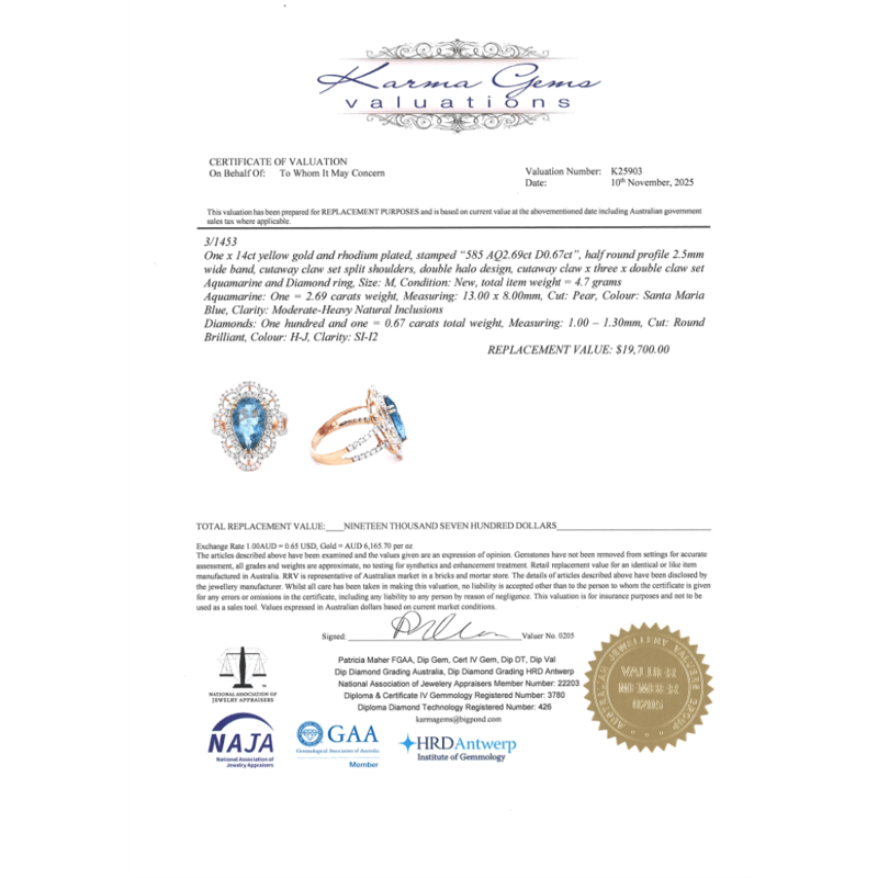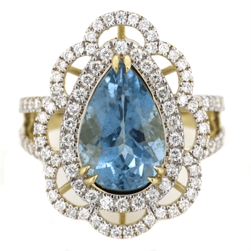 14K YELLOW GOLD, AQUAMARINE AND DIAMOND, DOUBLE HALO SPLIT BAND RING. The Centre Features, One Pear Cut, Santa Maria Blue, Aquamarine (4.25Ct, Moderate Heavy), 3 Double Claw Set. Surrounding The Centre In A Double Halo Design And Decorating The Split Band Are, 101 Round Brilliant Cut, Diamonds (0.67Ct Tdw, H-J Colour, Si-I2 Clarity), Claw Set. Ring Size M. Jewellery Valuations Provided By A Third Party Professional Not Directly Associated With Lloyds Auctions at AUD $19,700.00This Insurance Valuation has been provided by a registered Jewellery Valuer and is intended for insurance purposes only. The valuation amount has no bearing on the auction value of the item. Any questions regarding the valuation should be directed to the issuing Valuer (refer to contact details on the certificate) as Lloyds have no association or relationship with the Valuer or the valuation amount contained within the valuation. Condition: NEW 0645874+83