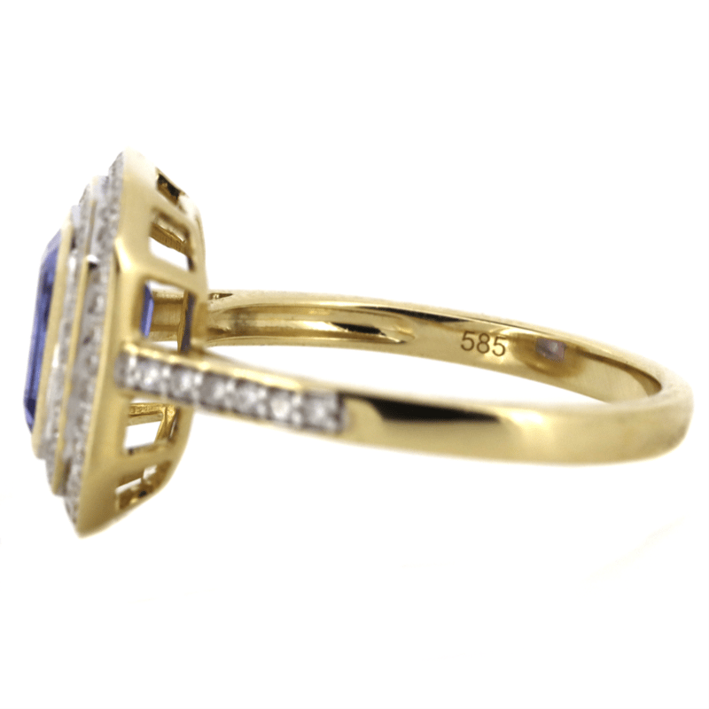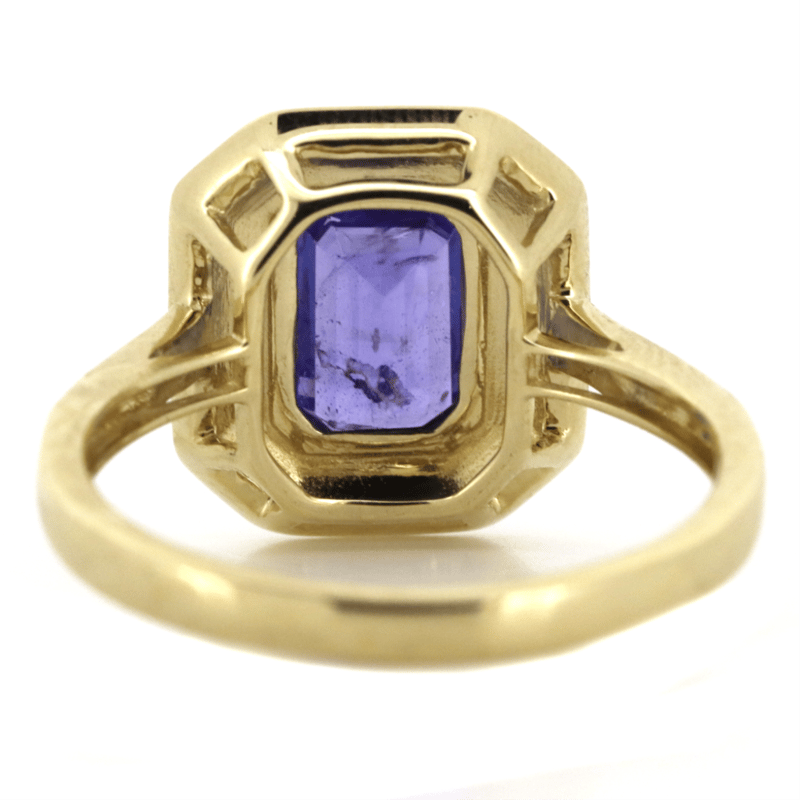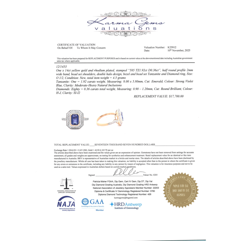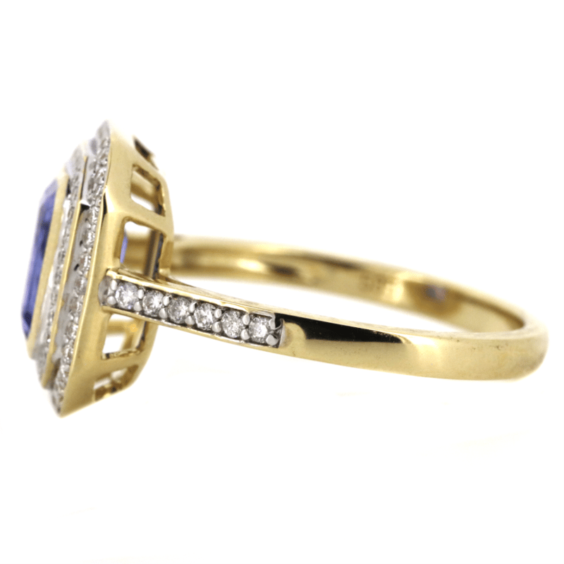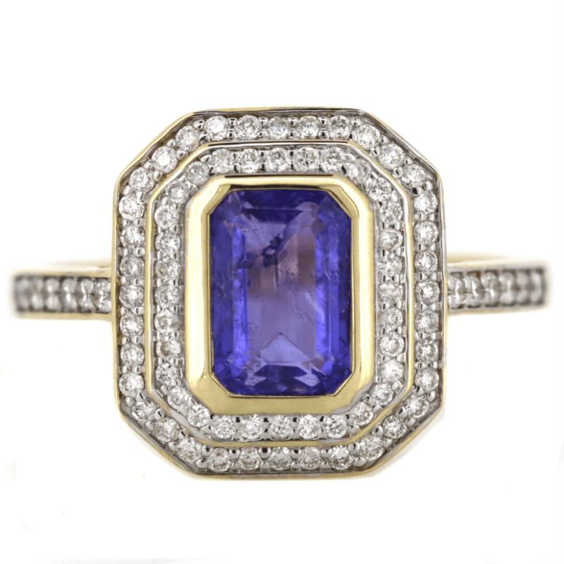 The Centre Features, One Emerald Cut, Medium Purplish Blue, Tanzanite (1.92Ct, Moderate-Heavily Included), Bezel Set. Surrounding The Centre In A Double Halo And Decorating The Band Are, 80 Round Brilliant Cut, Diamonds (0.36Ct Tdw, H-J Colour, Si-I2 Clarity), Bead Set. Ring Size O 1/2.