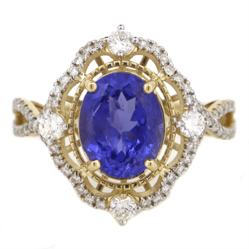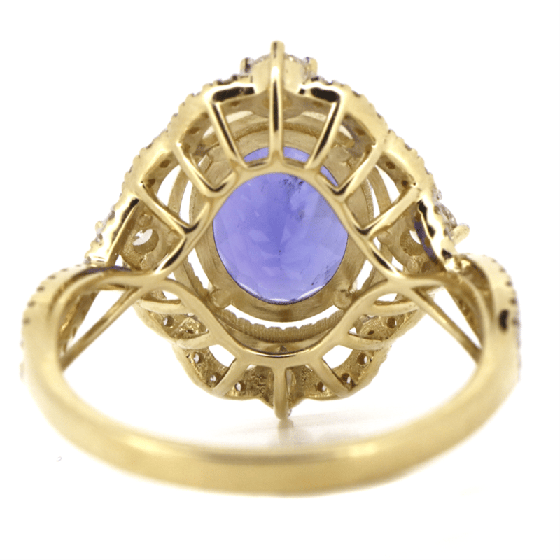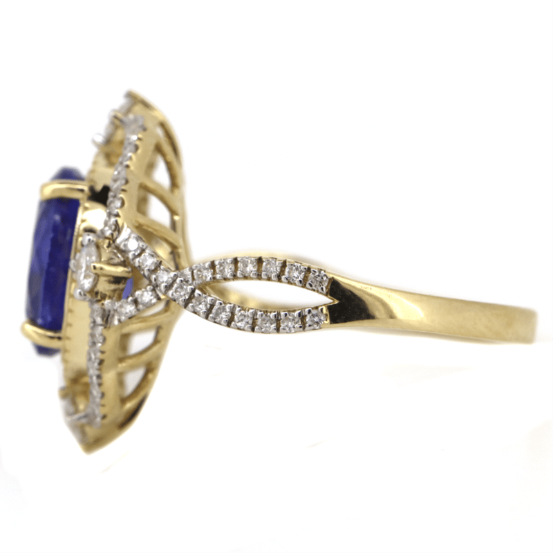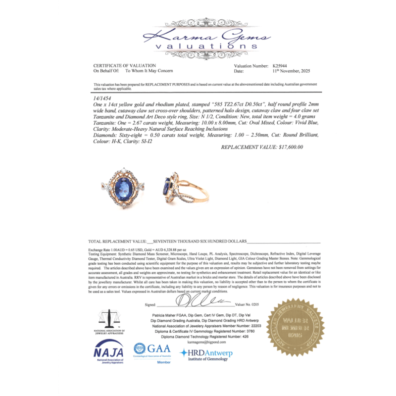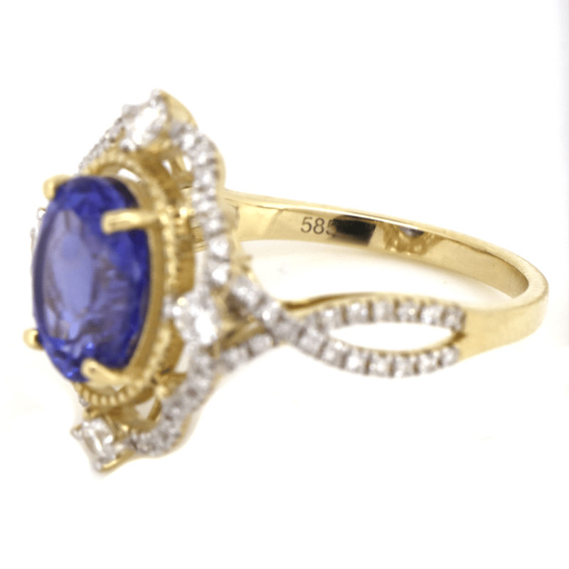 14K YELLOW GOLD, TANZANITE AND DIAMOND, DRESS RING. The Centre Features, One Oval Cut, Vivid Blue, Tanzanite (2.67Ct, Moderate-Heavy Natural Inclusions), 4 Claw Set In Yellow Gold. Embellishing The Design Are, 68 Round Brilliant Cut, Diamonds (0.50Ct Tdw, H-K Colour, Si-I2 Clarity), Bead/Claw Set. Ring Size N 1/2. Jewellery Valuations Provided By A Third Party Professional Not Directly Associated With Lloyds Auctions at AUD $17,600.00This Insurance Valuation has been provided by a registered Jewellery Valuer and is intended for insurance purposes only. The valuation amount has no bearing on the auction value of the item. Any questions regarding the valuation should be directed to the issuing Valuer (refer to contact details on the certificate) as Lloyds have no association or relationship with the Valuer or the valuation amount contained within the valuation. Condition: NEW 0645874+88