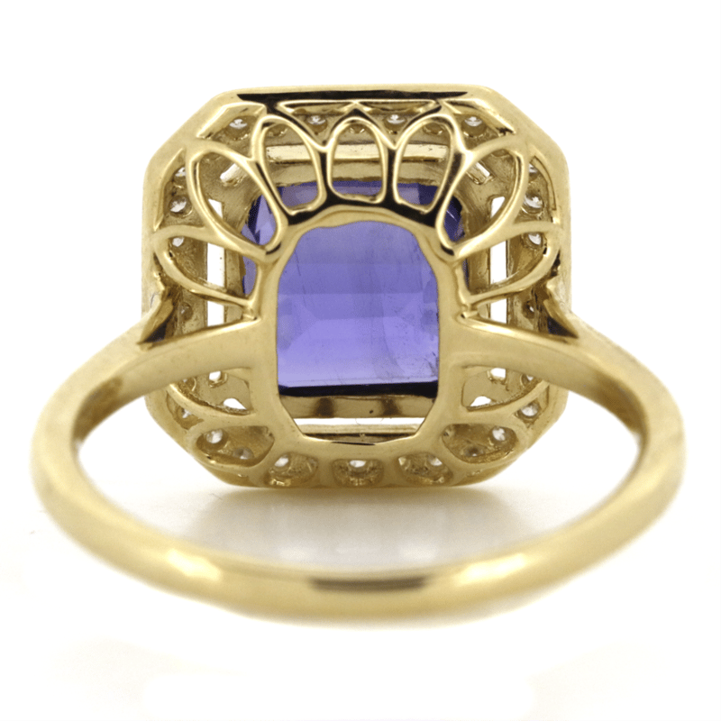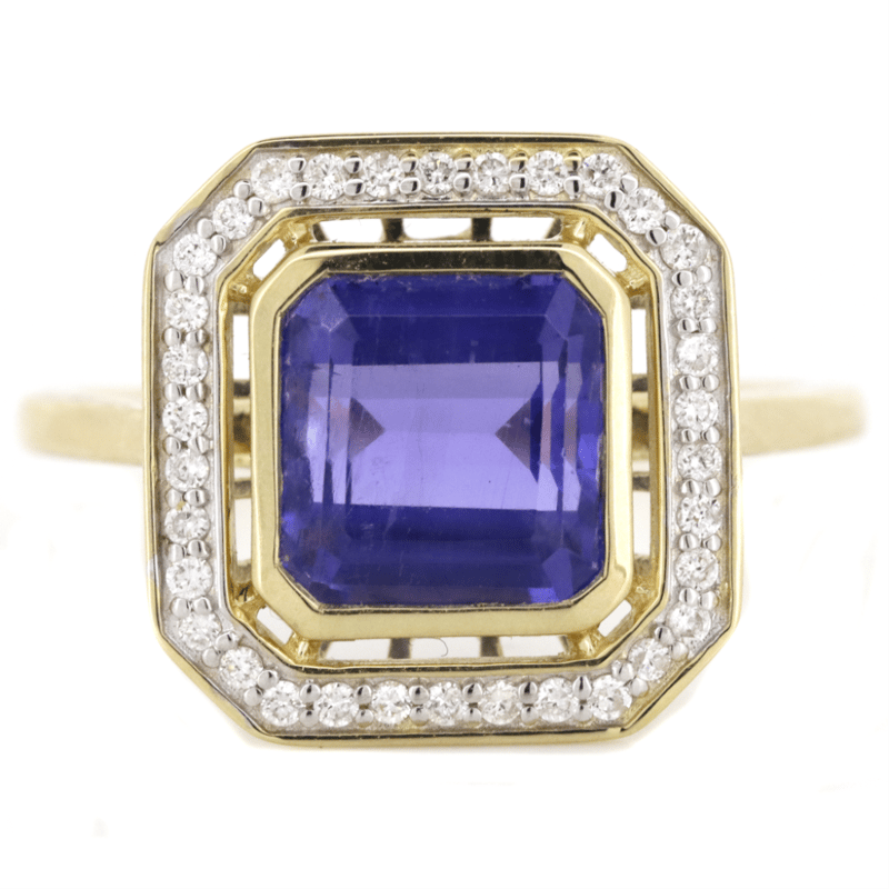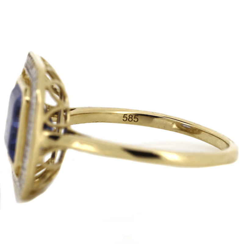 14K YELLOW GOLD, TANZANITE AND DIAMOND, HALO RING.