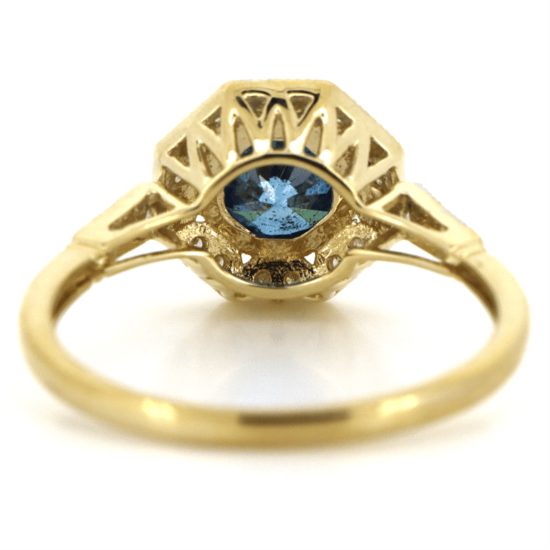 The Centre Features, One Round Brilliant Cut, Fancy Blue, Diamond (0.90Ct, I1 Clarity, Treated), Basket Set. Encompassing The Centre Are, 22 Round Brilliant Cut, Diamonds (0.14Ct Tdw, G-J Colour, Si-I2 Clarity), Bead Set. Ring Size N.