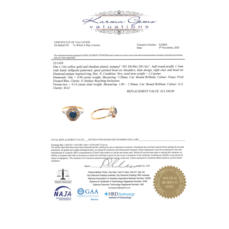 This Insurance Valuation has been provided by a registered Jewellery Valuer and is intended for insurance purposes only. The valuation amount has no bearing on the auction value of the item. Any questions regarding the valuation should be directed to the issuing Valuer (refer to contact details on the certificate) as Lloyds have no association or relationship with the Valuer or the valuation amount contained within the valuation.