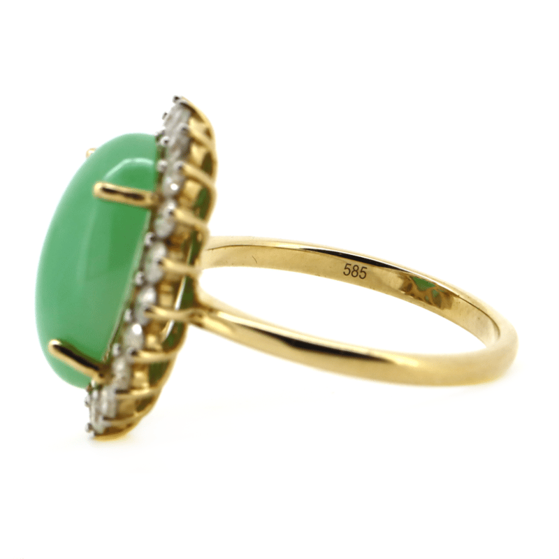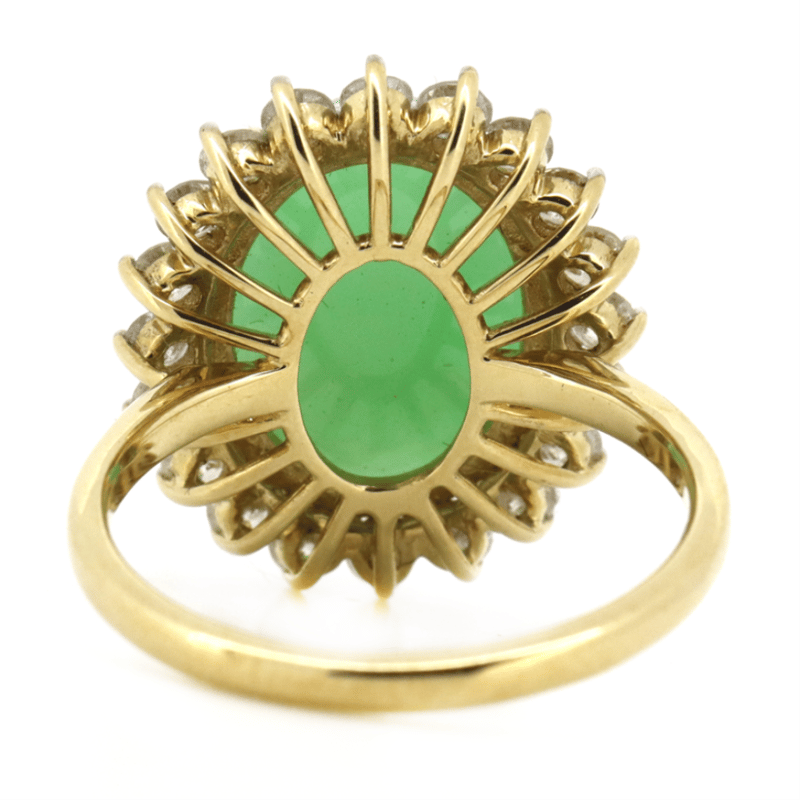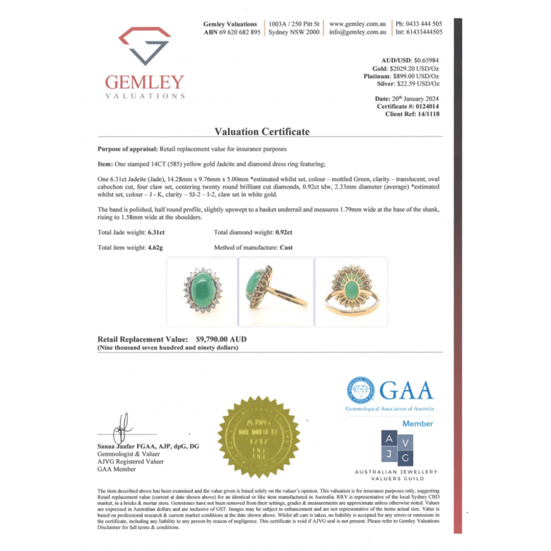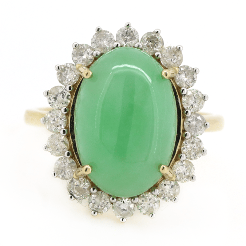 14K YELLOW GOLD, 6.31CT JADEITE AND DIAMOND, STATEMENT RING. The Centre Features, One Oval Cabochon Cut, Mottled Green, Jadeite (6.31Ct, Translucent), 4 Claw Set. Surrounding The Centre In A Halo Are, 20 Round Brilliant Cut, Diamonds (0.92Ct Tdw, J-K Colour, Si2-I2 Clarity), Claw Set In White Gold. Ring Size M 1/2. Jewellery Valuations Provided By A Third Party Professional Not Directly Associated With Lloyds Auctions at AUD $9,790.00This Insurance Valuation has been provided by a registered Jewellery Valuer and is intended for insurance purposes only. The valuation amount has no bearing on the auction value of the item. Any questions regarding the valuation should be directed to the issuing Valuer (refer to contact details on the certificate) as Lloyds have no association or relationship with the Valuer or the valuation amount contained within the valuation. Condition: NEW 0645874+90