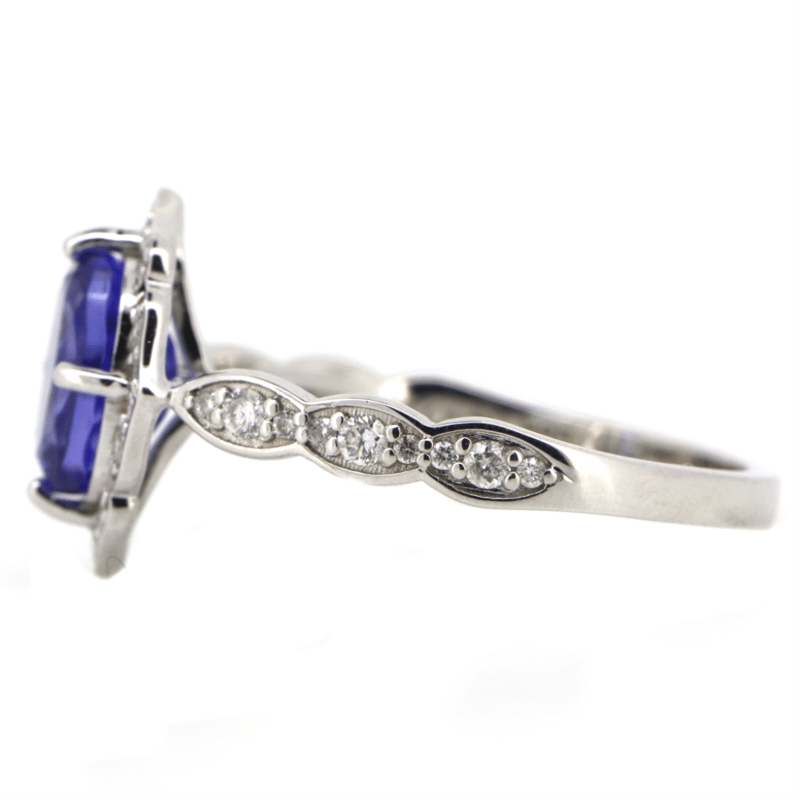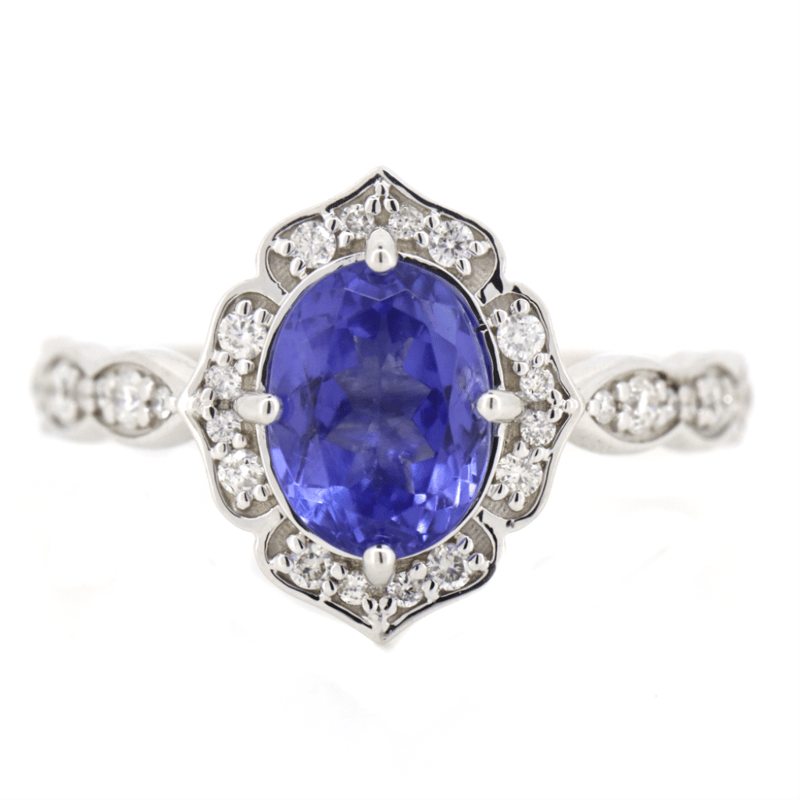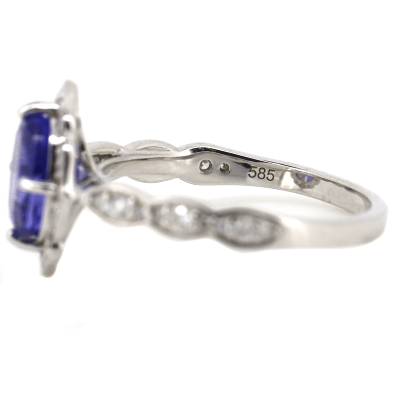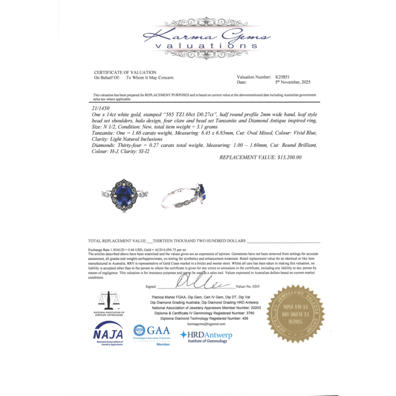 14K WHITE GOLD, TANZANITE AND DIAMOND, HALO RING. The Centre Features, One Oval Cut, Vivid Blue, Tanzanite (1.68Ct, Light Natural Inclusions), 4 Claw Set. Surrounding The Centre Are, 34 Round Brilliant Cut, Diamonds (0.27Ct Tdw, H-J Colour, Si-I2 Clarity), Bead Set. Ring Size N 1/2. Jewellery Valuations Provided By A Third Party Professional Not Directly Associated With Lloyds Auctions at AUD $13,200.00This Insurance Valuation has been provided by a registered Jewellery Valuer and is intended for insurance purposes only. The valuation amount has no bearing on the auction value of the item. Any questions regarding the valuation should be directed to the issuing Valuer (refer to contact details on the certificate) as Lloyds have no association or relationship with the Valuer or the valuation amount contained within the valuation. Condition: NEW 0645874+38
