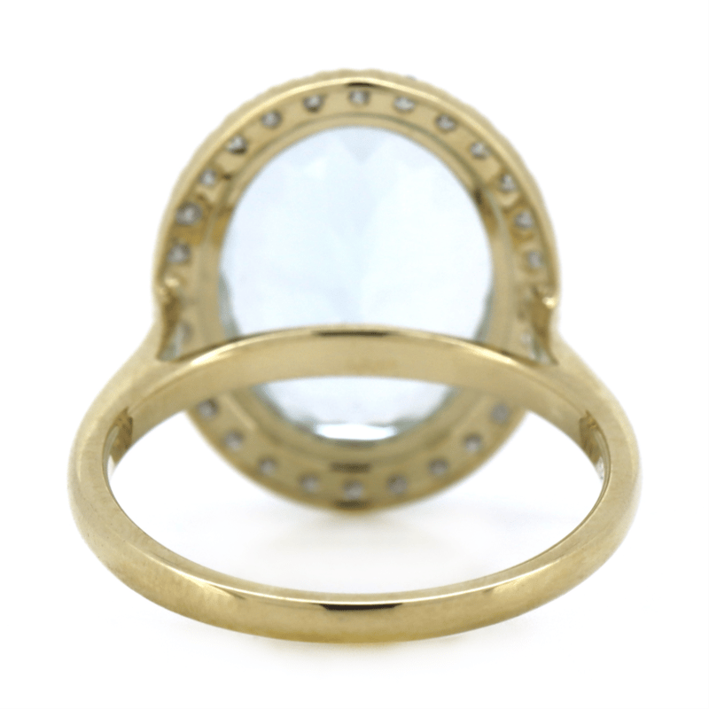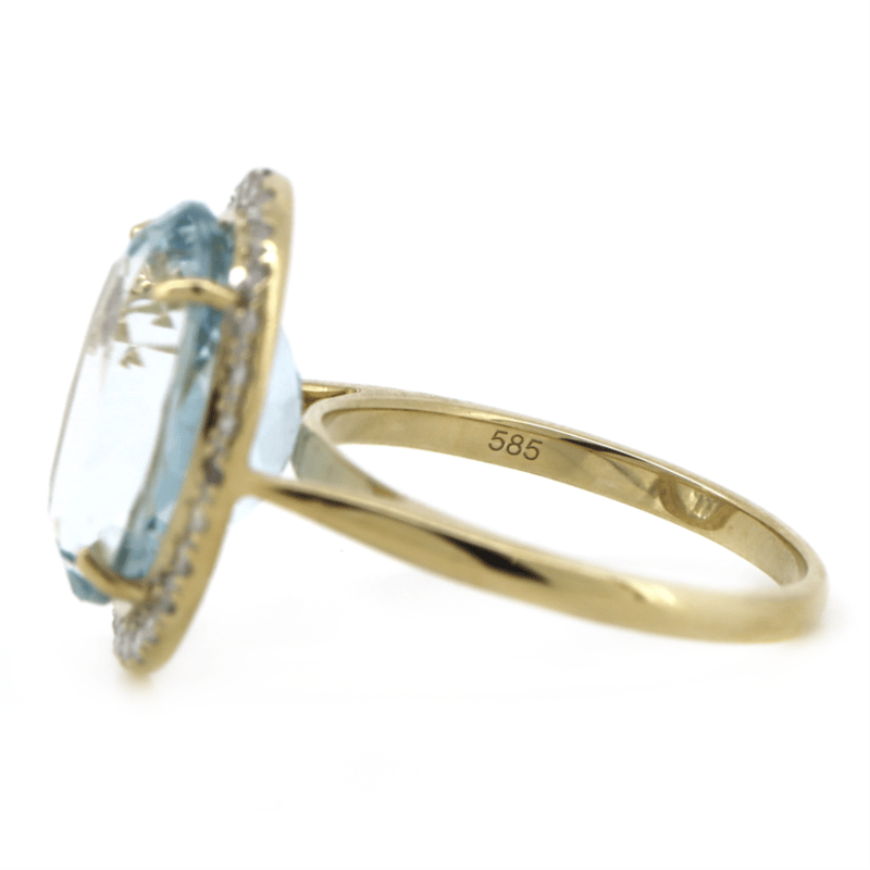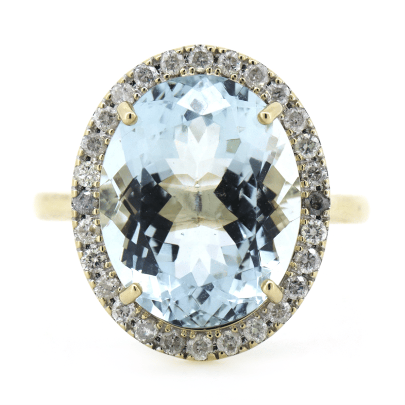 14K YELLOW GOLD, AQUAMARINE AND DIAMOND, HALO RING.