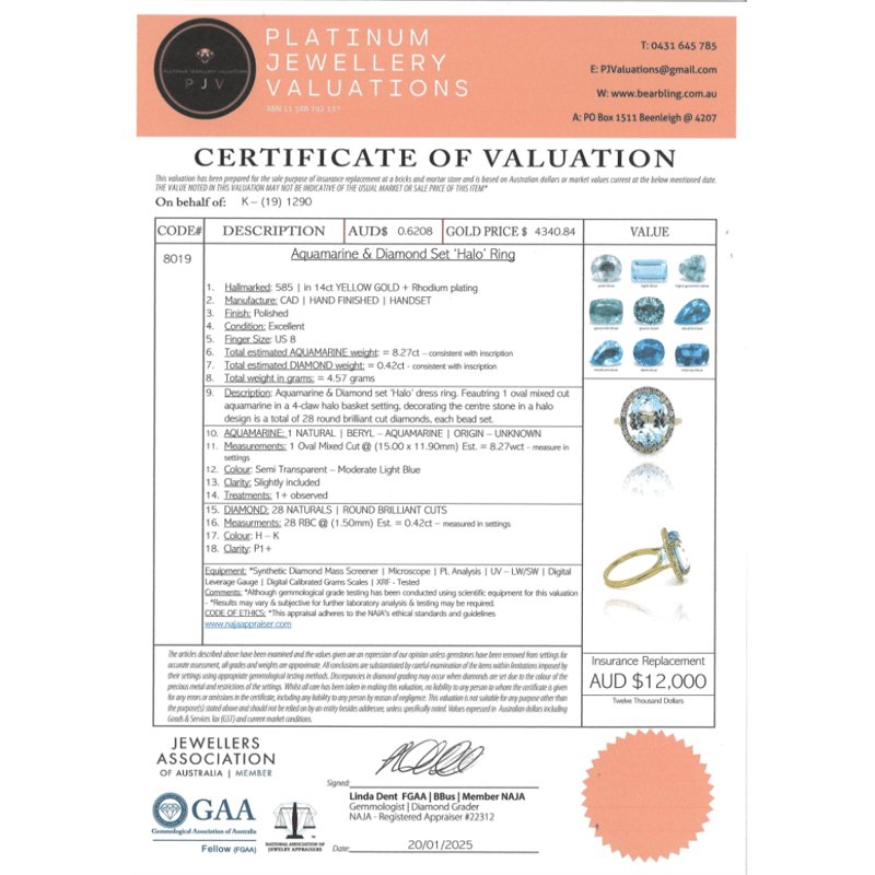 This Insurance Valuation has been provided by a registered Jewellery Valuer and is intended for insurance purposes only. The valuation amount has no bearing on the auction value of the item. Any questions regarding the valuation should be directed to the issuing Valuer (refer to contact details on the certificate) as Lloyds have no association or relationship with the Valuer or the valuation amount contained within the valuation.