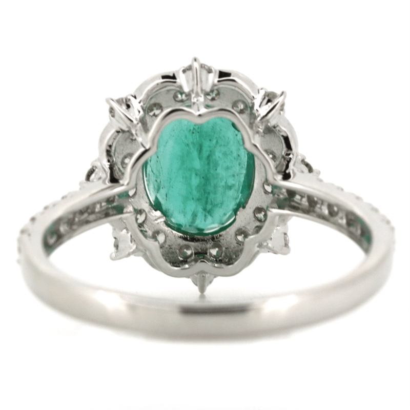 The Centre Features, One Oval Cut, Emerald (1.31Ct, Moderately Included), Claw Set. Decorating The Halo And The Band Are, 36 Round Brilliant Cut, Diamonds (0.56Ct Tdw, G-H Colour, Si1-Si2 Clarity), Bead Set. Ring Size N 1/2.
