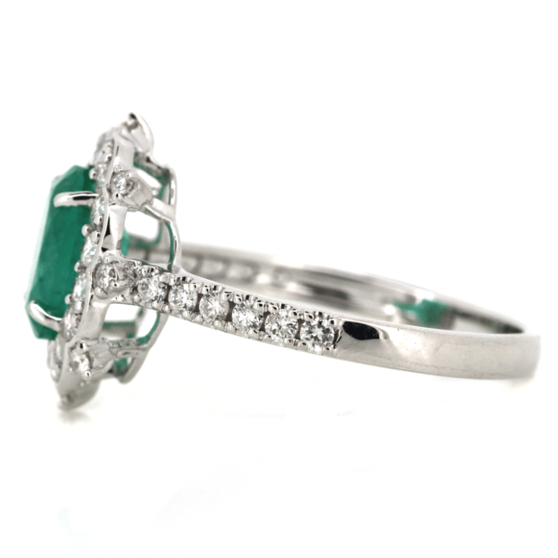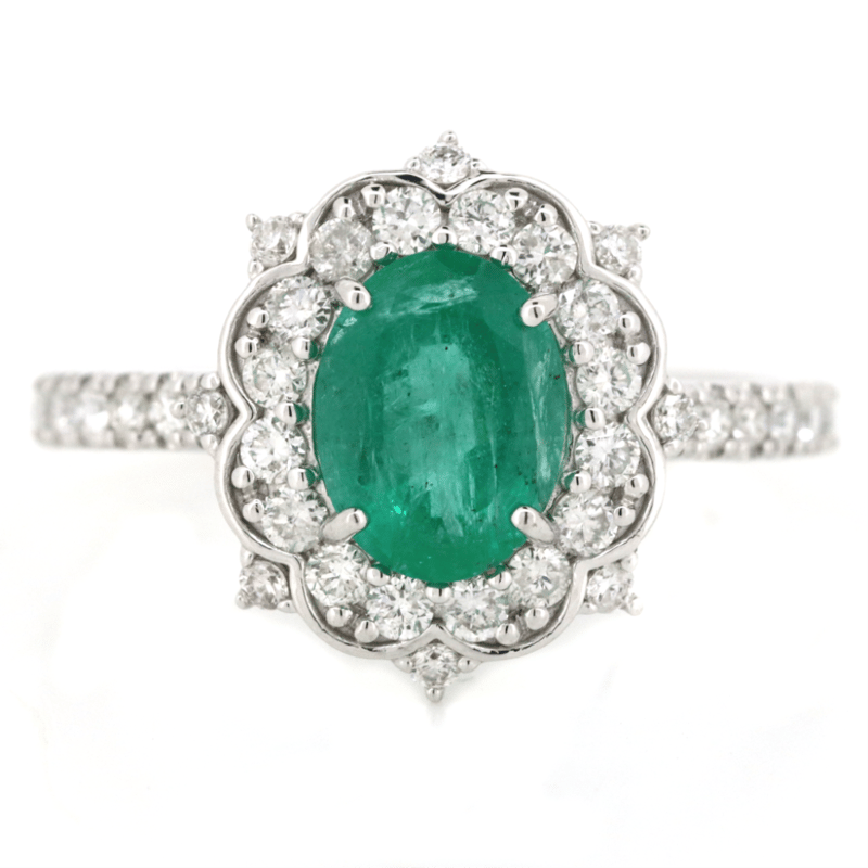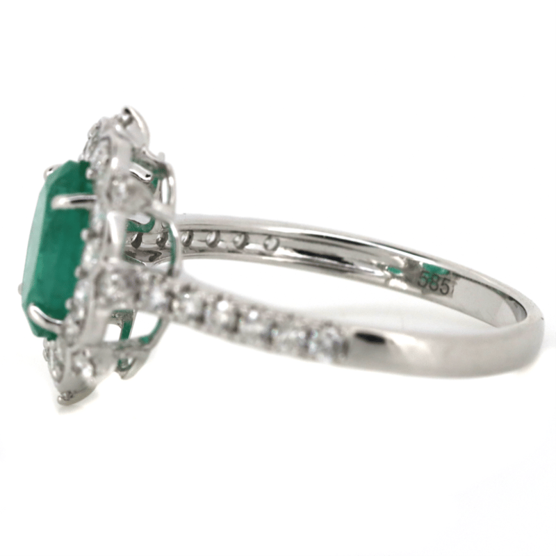 14K WHITE GOLD, EMERALD AND DIAMOND, HALO RING.