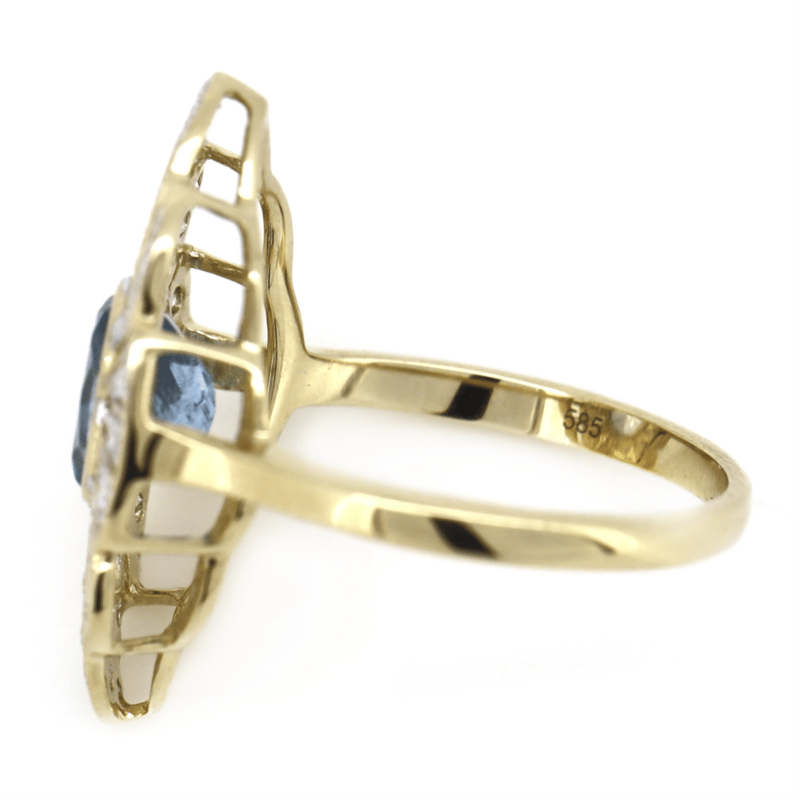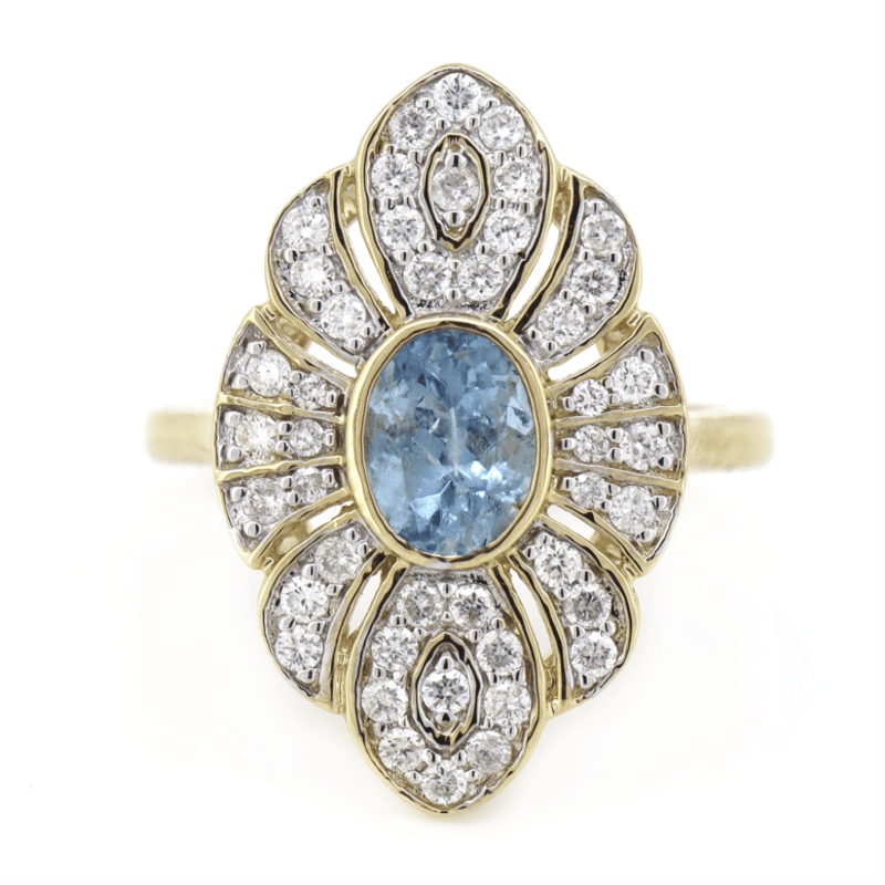 14K YELLOW GOLD, AQUAMARINE AND DIAMOND, DECORATIVE RING.