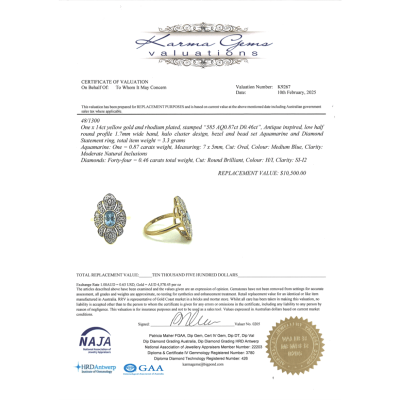 This Insurance Valuation has been provided by a registered Jewellery Valuer and is intended for insurance purposes only. The valuation amount has no bearing on the auction value of the item. Any questions regarding the valuation should be directed to the issuing Valuer (refer to contact details on the certificate) as Lloyds have no association or relationship with the Valuer or the valuation amount contained within the valuation.