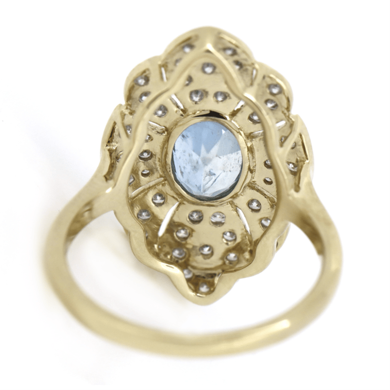The Centre Features, One Oval Cut, Medium Blue, Aquamarine (0.87Ct, Moderate Natural Inclusions), Bezel Set. Decorating The Setting Are, 44 Round Brilliant Cut, Diamonds (0.46Ct Tdw, H-I Colour, Si-I2 Clarity), Bead Set In White Gold. Ring Size L.