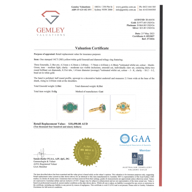 This Insurance Valuation has been provided by a registered Jewellery Valuer and is intended for insurance purposes only. The valuation amount has no bearing on the auction value of the item. Any questions regarding the valuation should be directed to the issuing Valuer (refer to contact details on the certificate) as Lloyds have no association or relationship with the Valuer or the valuation amount contained within the valuation.