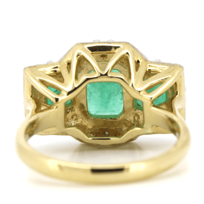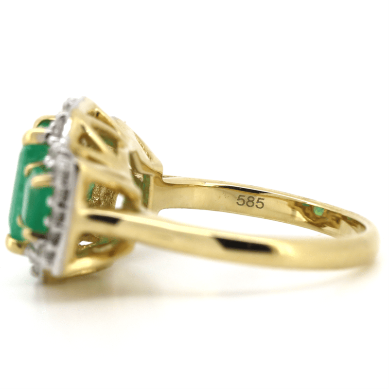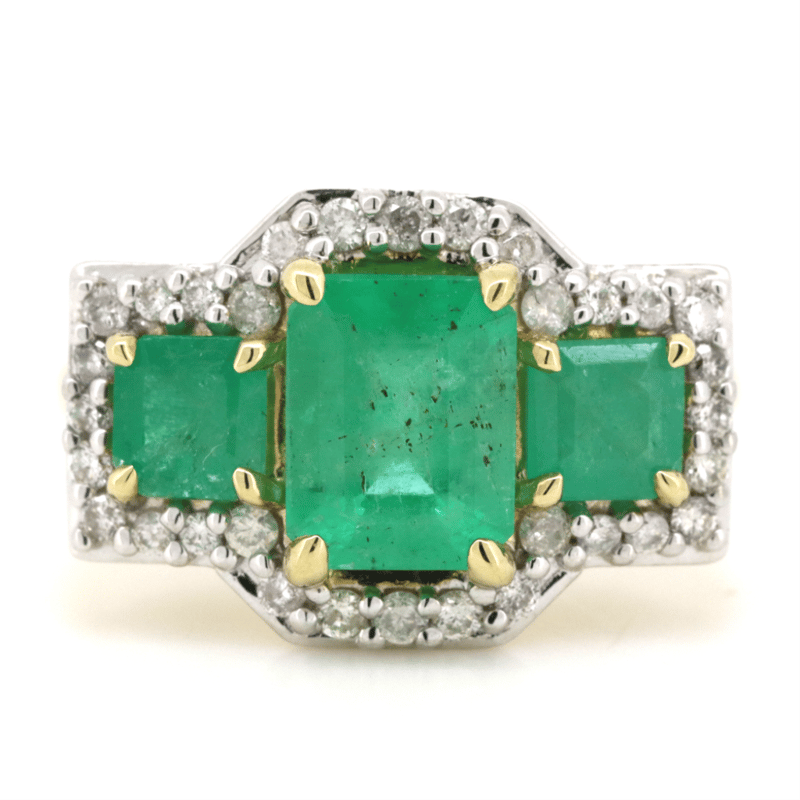 14K YELLOW GOLD, EMERALD AND DIAMOND, HALO TRILOGY RING.