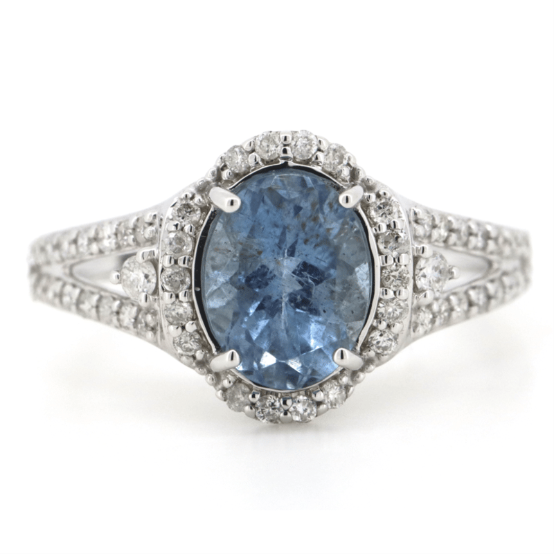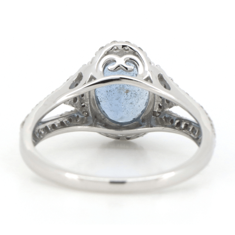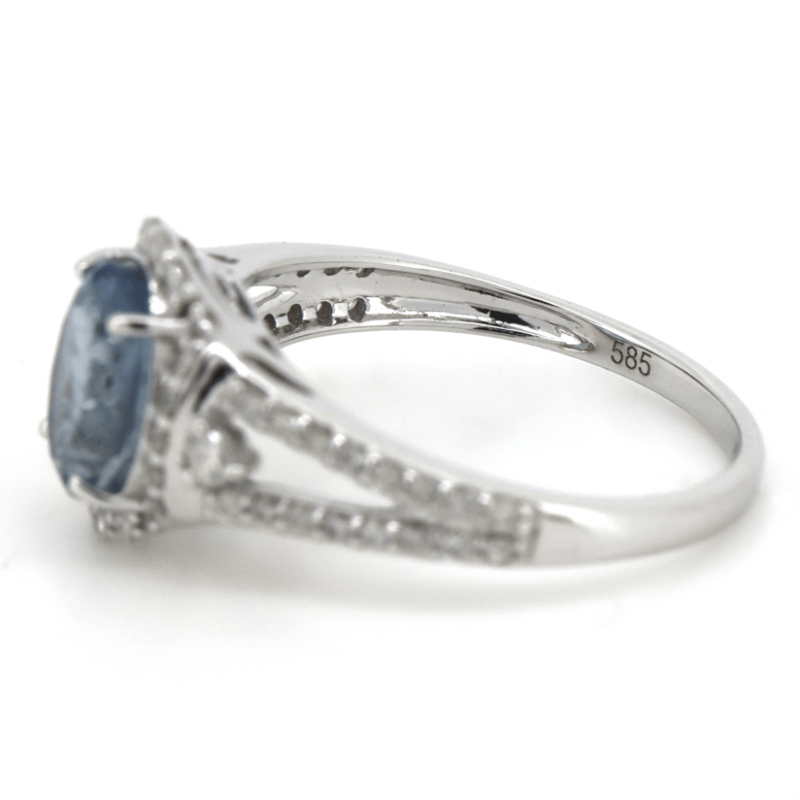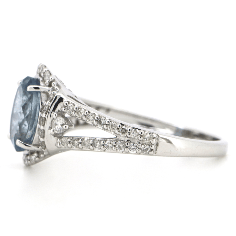14K WHITE GOLD, AQUAMARINE AND DIAMOND, HALO SPLIT BAND RING.
