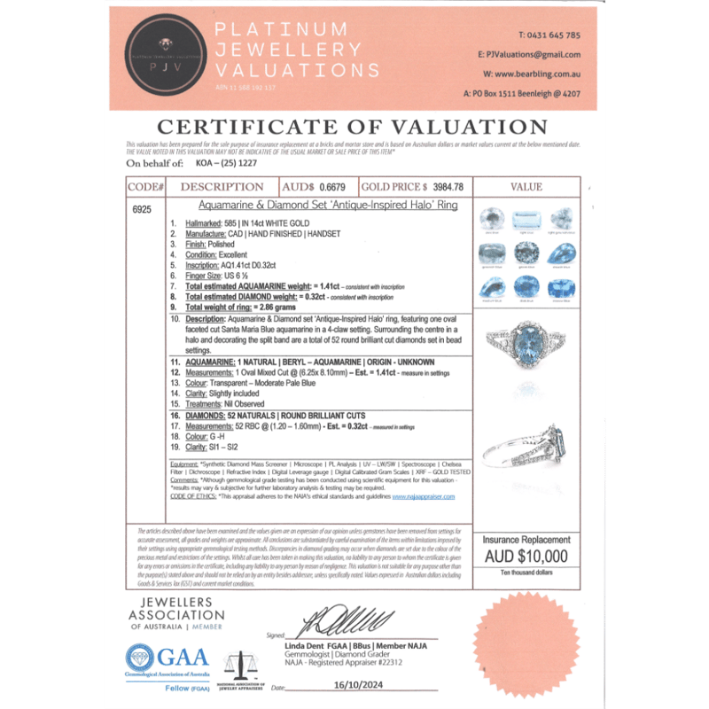 This Insurance Valuation has been provided by a registered Jewellery Valuer and is intended for insurance purposes only. The valuation amount has no bearing on the auction value of the item. Any questions regarding the valuation should be directed to the issuing Valuer (refer to contact details on the certificate) as Lloyds have no association or relationship with the Valuer or the valuation amount contained within the valuation.