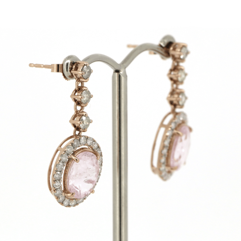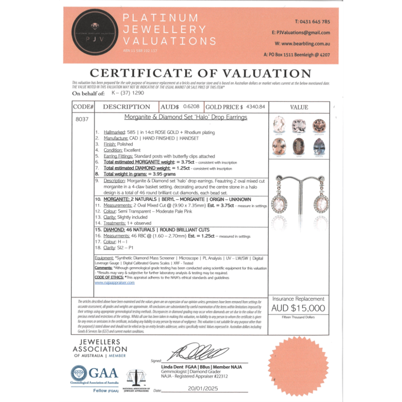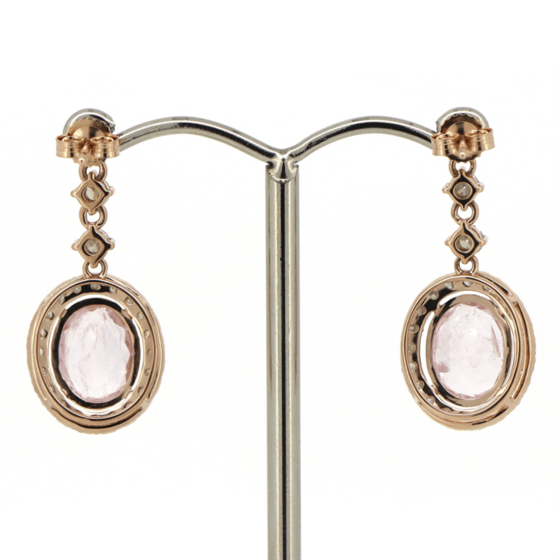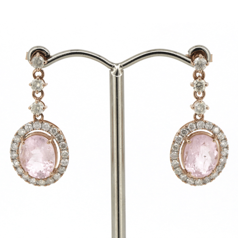 14K ROSE GOLD, PINK MORGANITE AND DIAMOND, HALO DROP EARRINGS. The Centres Feature, 2 Oval Mixed Cut, Moderate Pale Pink, Morganites (3.75Ct Tsw, Slightly Included), 4 Claw Basket Set. Surrounding The Centres In Halos Are Decorating The Drop Are, 46 Round Brilliant Cut, Diamonds (1.25Ct Tdw, H-I Colour, Si2-P1 Clarity), Bead Set. The Earrings Feature Posts With Butterfly Clips. Jewellery Valuations Provided By A Third Party Professional Not Directly Associated With Lloyds Auctions at AUD $$15,000.00This Insurance Valuation has been provided by a registered Jewellery Valuer and is intended for insurance purposes only. The valuation amount has no bearing on the auction value of the item. Any questions regarding the valuation should be directed to the issuing Valuer (refer to contact details on the certificate) as Lloyds have no association or relationship with the Valuer or the valuation amount contained within the valuation. Condition: NEW 0645882+27