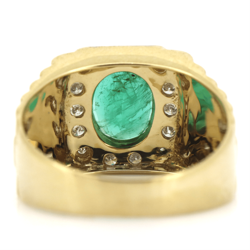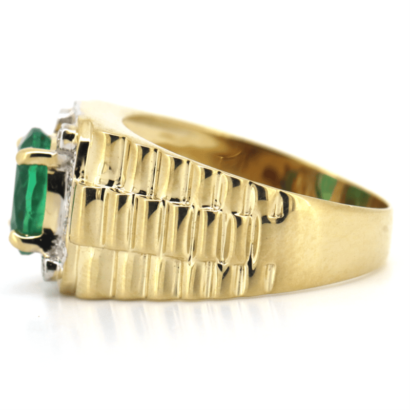 14K YELLOW GOLD, EMERALD AND DIAMOND, GENTS RING.