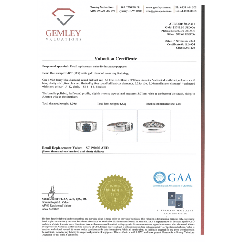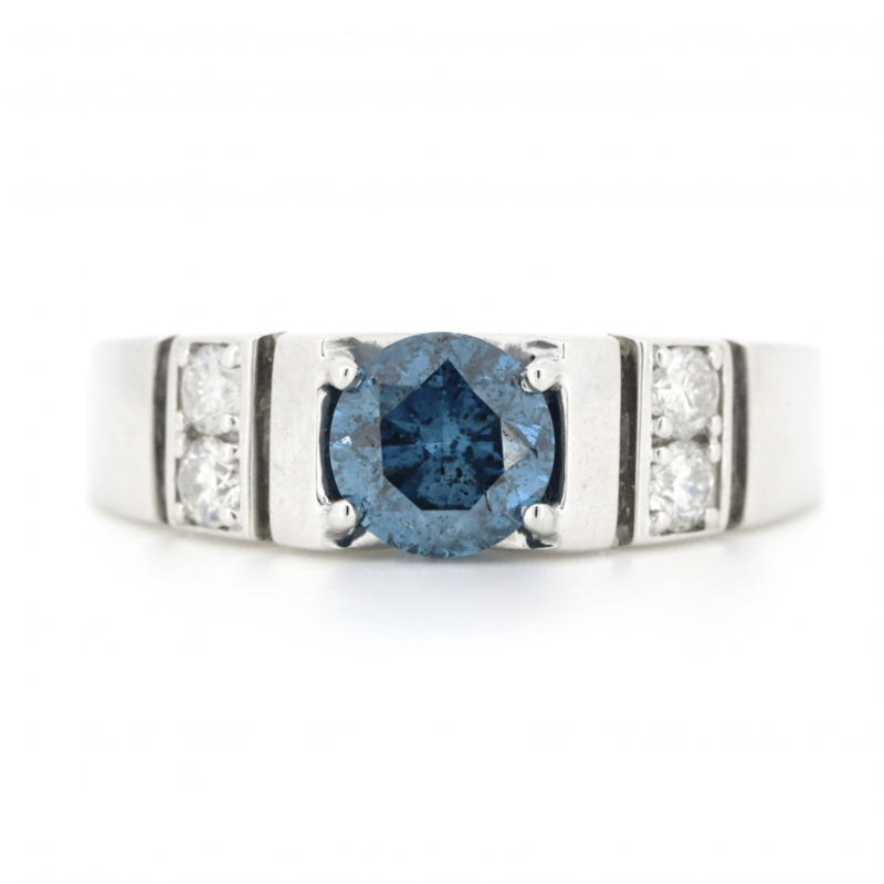 14K WHITE GOLD, FANCY BLUE DIAMOND, DRESS RING. The Centre Features, One Round Brilliant Cut, Vivid Blue, Diamond (1.02Ct Tdw, I1 Clarity), 4 Claw Set. Flanking Either Side Of The Centre Are, 4 Round Brilliant Cut, Diamonds (0.28Ct Tdw, J-K Colour, Si1-I1 Clarity), 4 Claw Box Settings. Ring Size Q. Jewellery Valuations Provided By A Third Party Professional Not Directly Associated With Lloyds Auctions at AUD $$7,190.00This Insurance Valuation has been provided by a registered Jewellery Valuer and is intended for insurance purposes only. The valuation amount has no bearing on the auction value of the item. Any questions regarding the valuation should be directed to the issuing Valuer (refer to contact details on the certificate) as Lloyds have no association or relationship with the Valuer or the valuation amount contained within the valuation. Condition: NEW 0645882+42