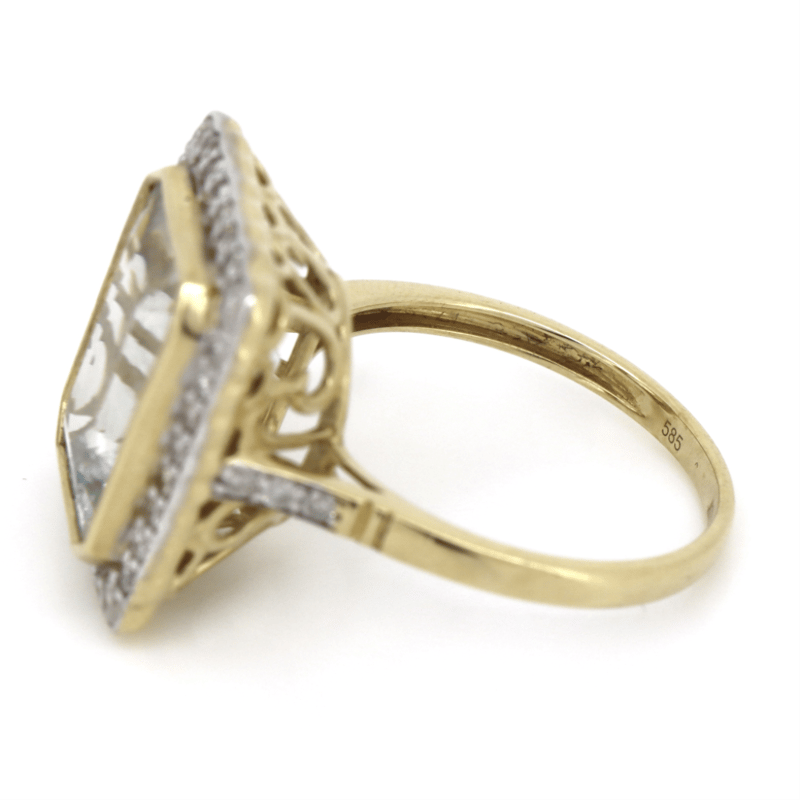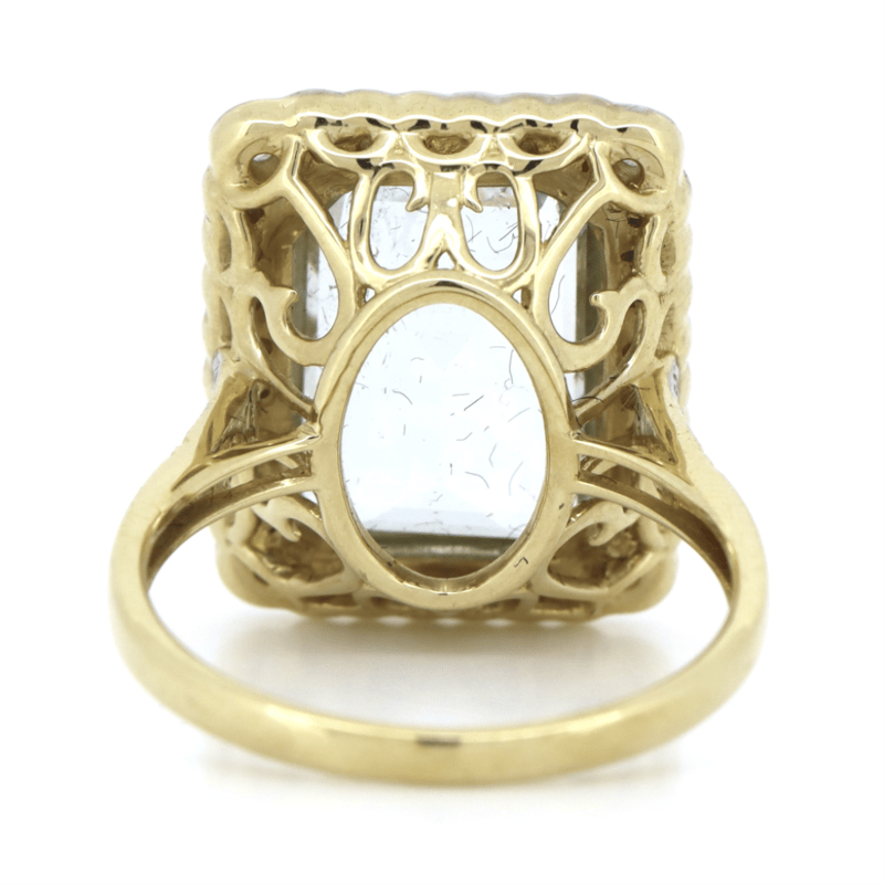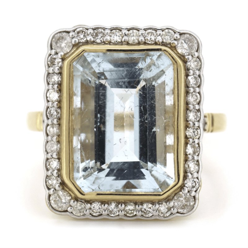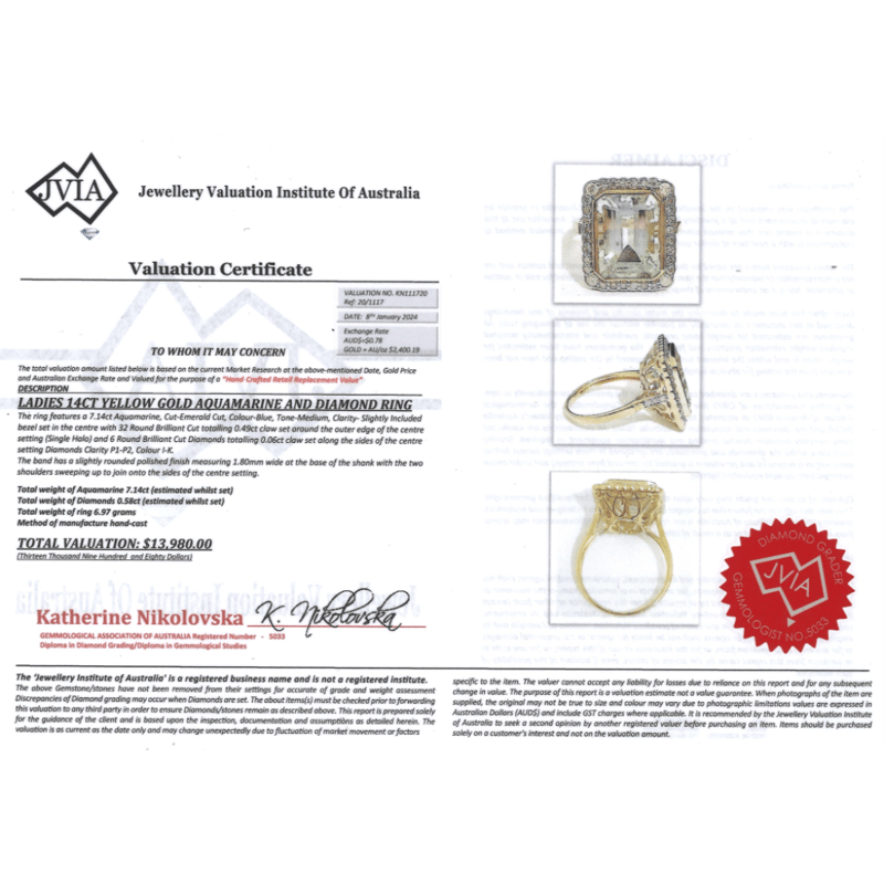 14K YELLOW GOLD, 7.14CT AQUAMARINE AND DIAMOND, STATEMENT RING. The Centre Features, One Emerald Cut, Medium Blue, Aquamarine (7.14Ct, Slightly Included), Bezel Set. Surrounding The Centre In A Halo And Decorating The Shoulders Are, 38 Round Brilliant Cut, Diamonds (0.58Ct Tdw, I-K Colour, P1-P2 Clarity), Bead Set In White Gold. Ring Size O. Jewellery Valuations Provided By A Third Party Professional Not Directly Associated With Lloyds Auctions at AUD $$13,980.00This Insurance Valuation has been provided by a registered Jewellery Valuer and is intended for insurance purposes only. The valuation amount has no bearing on the auction value of the item. Any questions regarding the valuation should be directed to the issuing Valuer (refer to contact details on the certificate) as Lloyds have no association or relationship with the Valuer or the valuation amount contained within the valuation. Condition: NEW 0645882+70