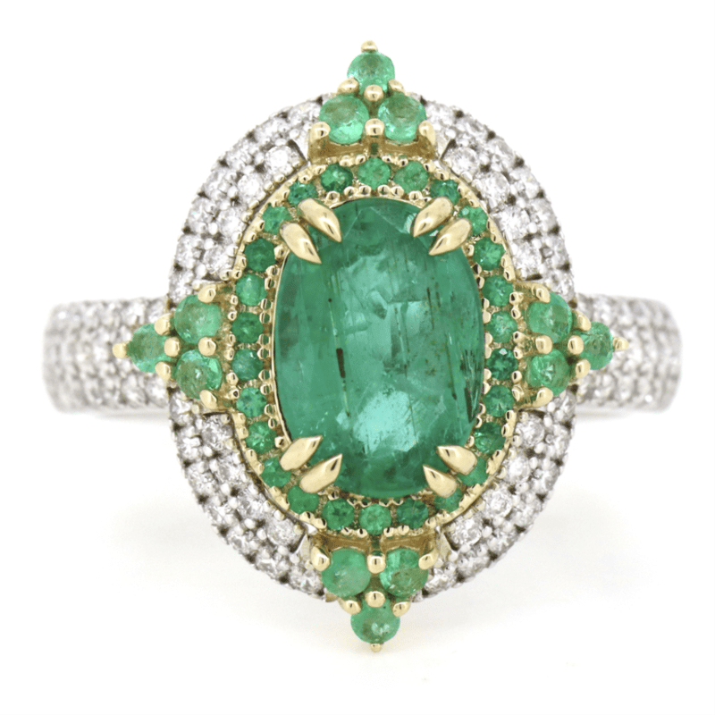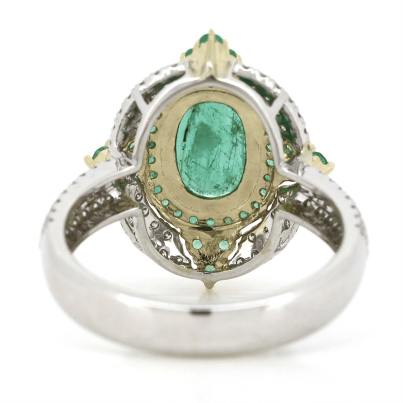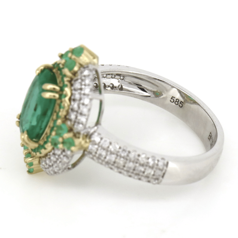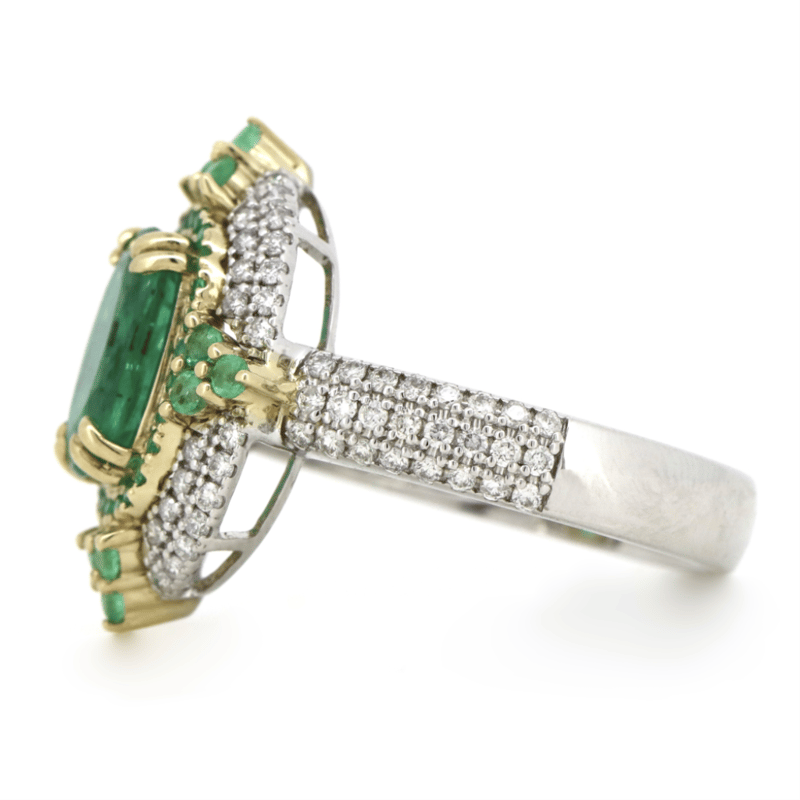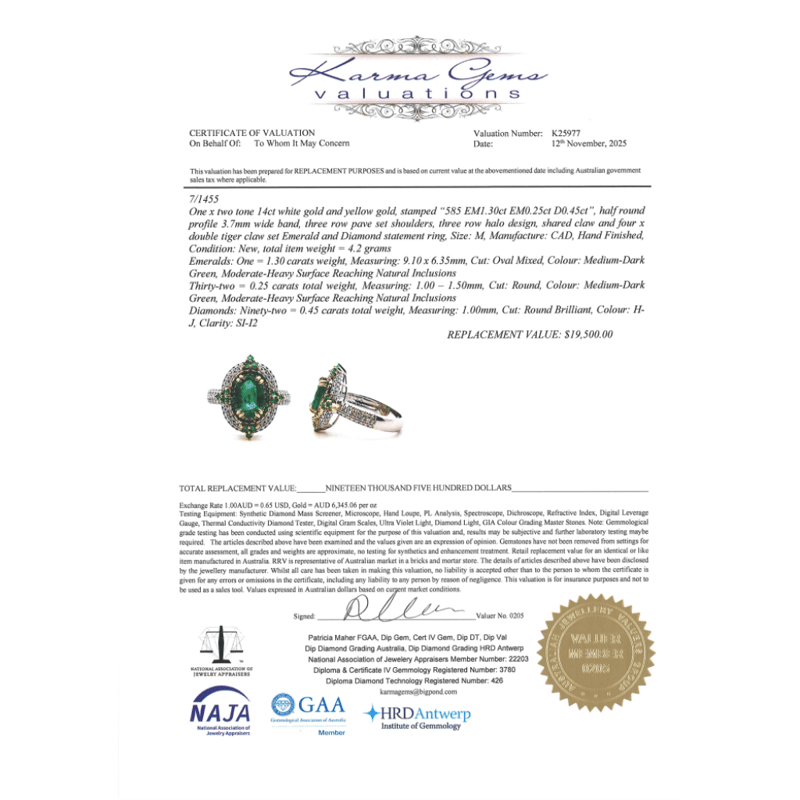 14K WHITE/YELLOW GOLD, EMERALD AND DIAMOND, COCKTAIL RING. The Centre Features, One Oval Cut, Medium-Dark Green, Emerald (1.30Ct, Moderate-Heavy Surface Reaching Inclusions), Double 4 Claw Set In Yellow Gold. Decorating The Design Are, 32 Round Cut, Medium-Dark Green, Emerald (0.25Ct Tdw, Moderate-Heavy Surface Reaching Inclusions), 3 Claw Set In Yellow Gold. Embellishing The Design Are, 92 Round Brilliant Cut, Diamonds (0.45Ct Tdw, H-J Colour, Si-I2 Clarity), Bead/Pave Set In White Gold. Ring Size M. Jewellery Valuations Provided By A Third Party Professional Not Directly Associated With Lloyds Auctions at AUD $$19,500.00This Insurance Valuation has been provided by a registered Jewellery Valuer and is intended for insurance purposes only. The valuation amount has no bearing on the auction value of the item. Any questions regarding the valuation should be directed to the issuing Valuer (refer to contact details on the certificate) as Lloyds have no association or relationship with the Valuer or the valuation amount contained within the valuation. Condition: NEW 0645882+77