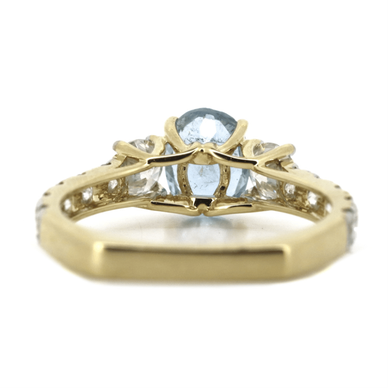 14K YELLOW GOLD, AQUAMARINE AND DIAMOND, TRILOGY RING.